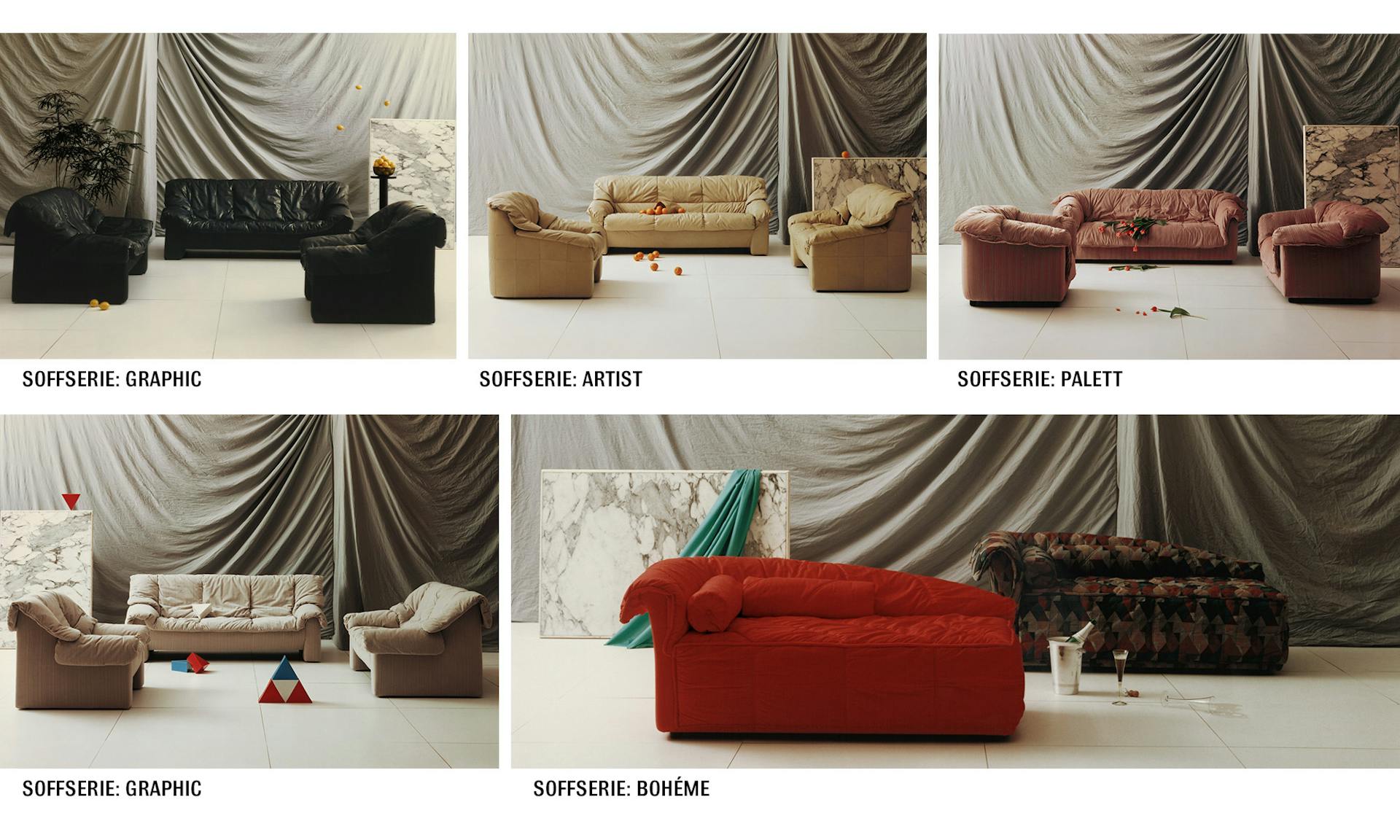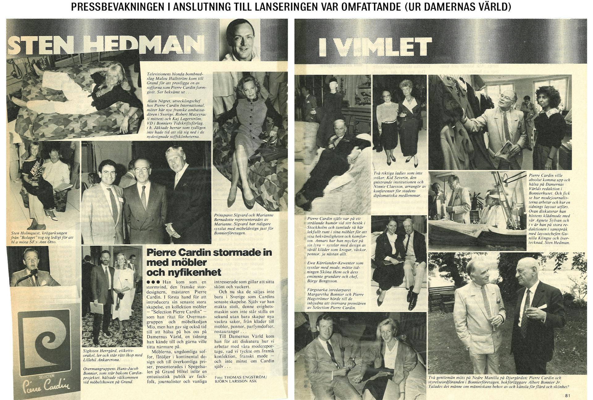 Möbelkollektionen presenterades till elektroniska toner av legendariske syntsymfonikern Jean-Michel Jarre och under stor dramatik föll de vita överdragen från Cardins soffor. Sofforna präglades enligt Borås Tidning av ”en god smak kombinerad med sinne för bekvämlighet”.