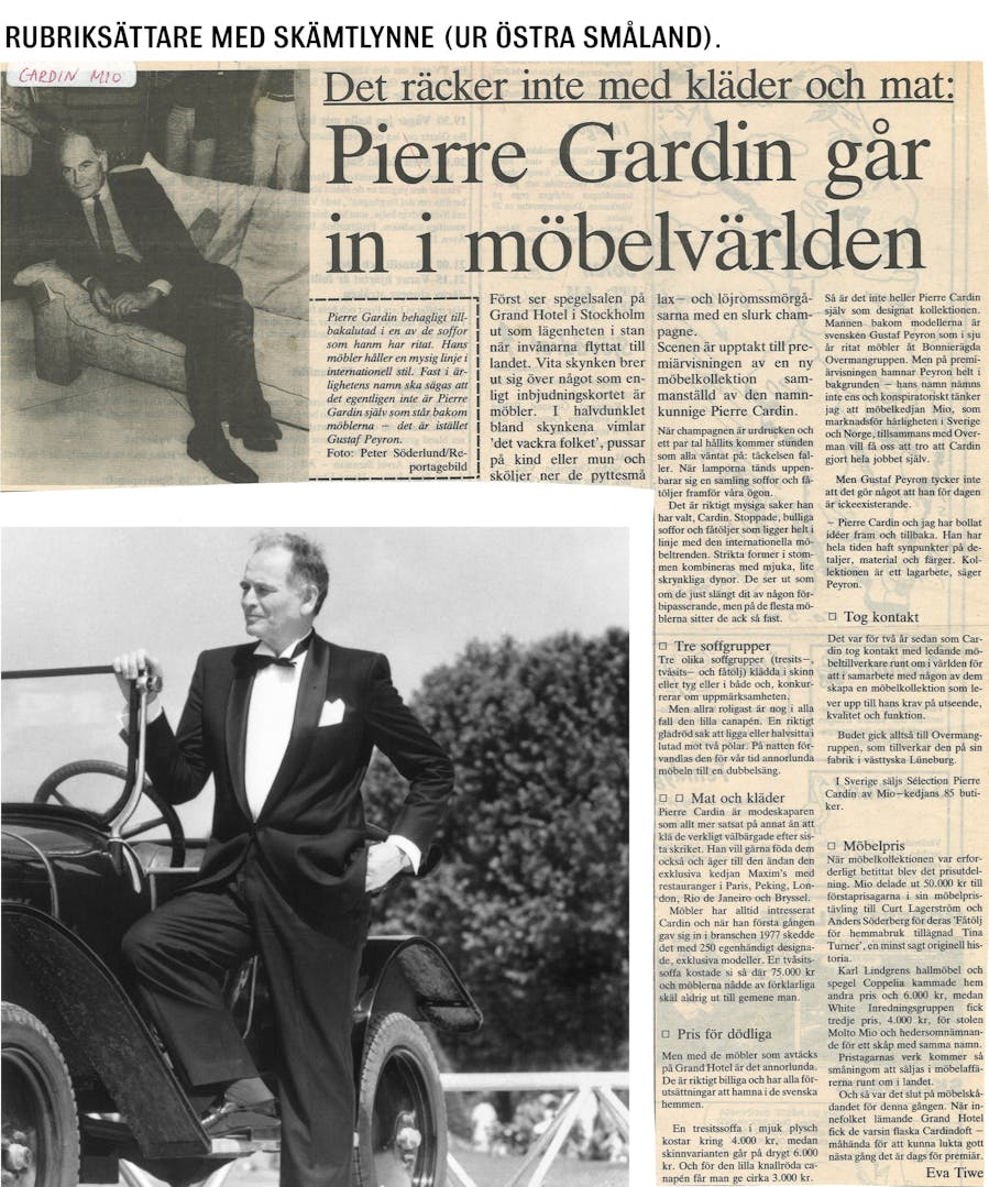 Att Cardin var en man av folket och hade en känsla för entreprenörskap finns det många bevis för. Bara en sådan sak som samarbetet med Mio på 80-talet! Han gav han sig in i möbelbranschen redan 1977 med 250 egna modeller och startade Galerie Meubles. 1985 var det som den världsberömde designern, tillsammans med inredningsarkitekten Gustaf Peyron, tog fram en vida omtalad soffkollektion som Mio fick äran att marknadsföra och sälja. Sélection Pierre Cardin fick enorm uppmärksamhet och lanserades under pompa och ståt på Grand Hotel i Stockholm.