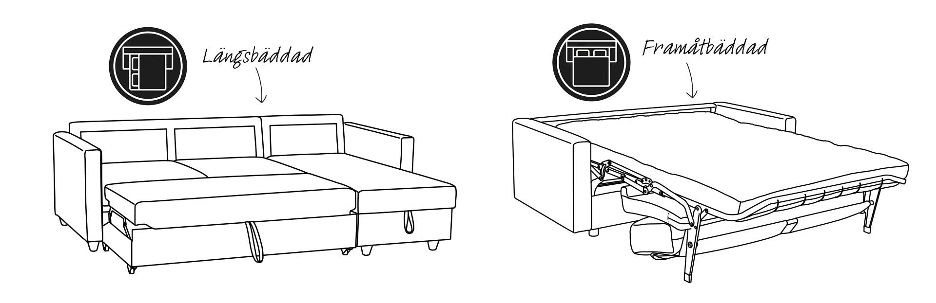 Längsbäddad och framåtbäddad är olika sätt din bäddsoffa kan bäddas ut på. En längsbäddad soffa är ofta lite bredare. Du ligger då i linje med ryggstödet vilket gör att bäddsoffan inte tar så mycket extra plats i rummet när den är utbäddad. En smalare soffa är normalt framåtbäddad för att bädden ska bli lagom lång. Du ligger med huvudet mot ryggstödet och bäddsoffan tar lite mer plats utåt i rummet.