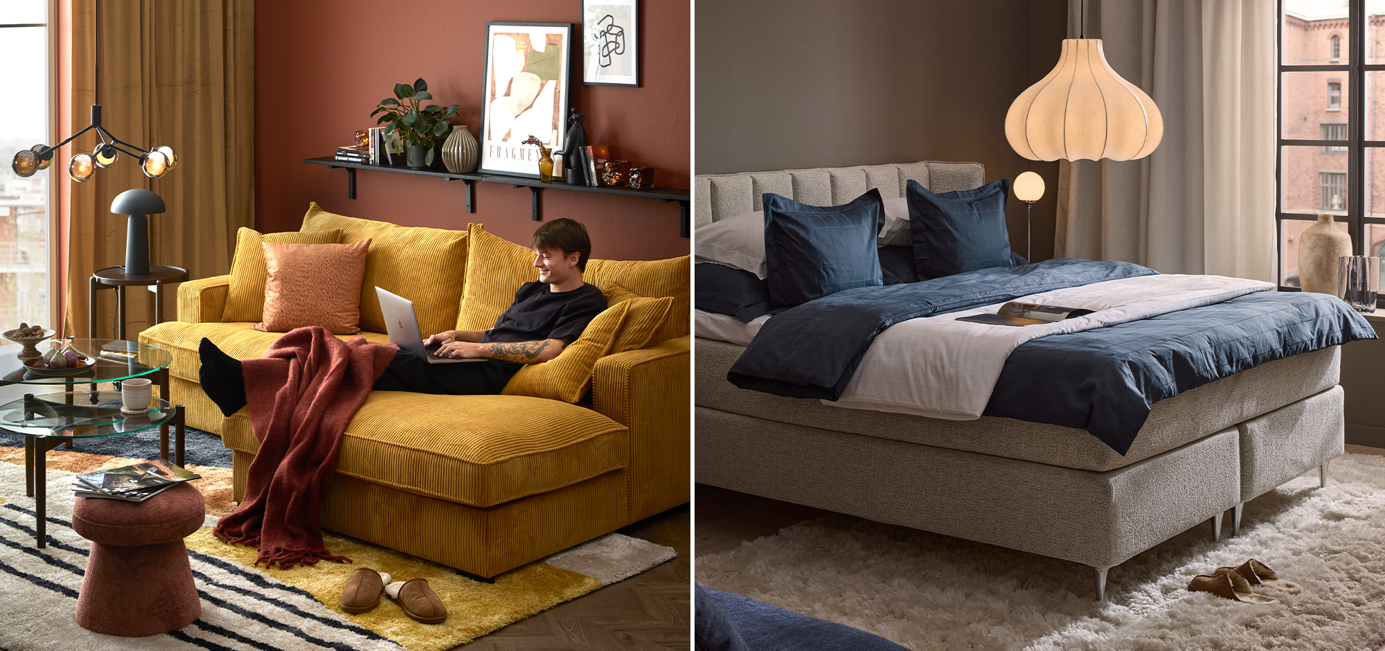 Har du en riktigt lång gardinstång kan du använda dig av två olika gardiner – eller sätt upp dubbla stänger och häng den ena gardinen bakom den andra! Det är fint och effektfullt att kombinera kraftiga tyger med skira och variera hur de dras för eller ifrån. Ibland vill du kanske släppa in maximalt med ljus, ibland sila det eller helt mörklägga. Med lager-på-lager får rummet inte bara en varm känsla, utan även en ombonad hemtrevlig dynamik. Mixa och matcha både material och färger. Ett tunt tyg i neutral färg skapar exempelvis ofta en mjuk och behaglig övergång från ett tyngre och mer färgstarkt material. Här är det bara din fantasi som sätter gränser!