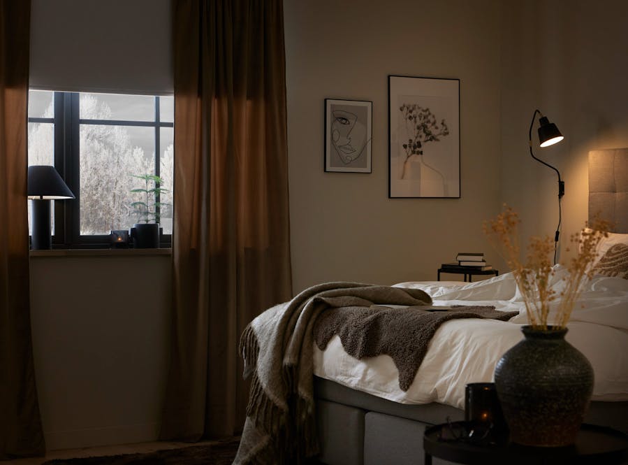 Gardiner gör att rummet känns mer ombonat och varmt. De är både fina och fungerar som extra isolering. Om du har element under fönstret är det bra att inte stänga in värmen genom att dra för dem. Använd istället en rullgardin som skyddar mot både sol och kyla.