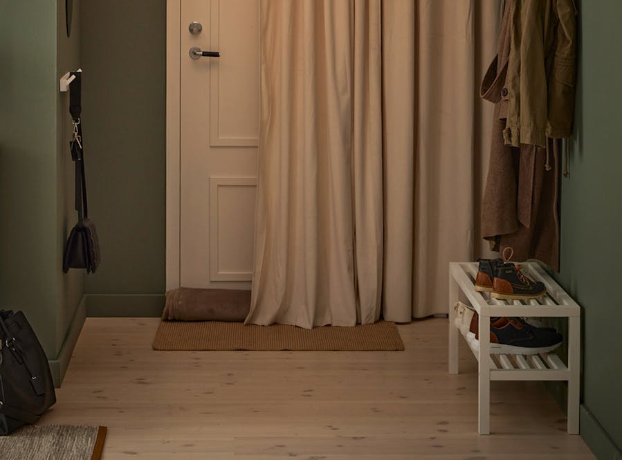 Drar det in kall luft vid ytterdörren? Sätt upp gardiner på insidan som stänger ute kylan. För att helgardera – lägg även en ihoprullad pläd längst ner som extra isolering.