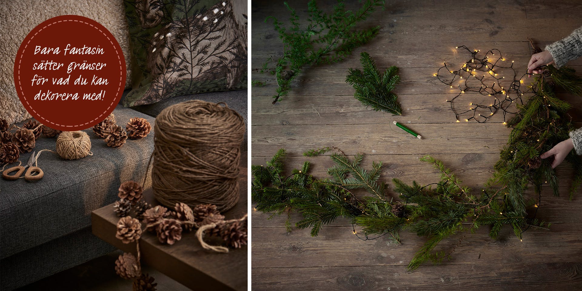 - Dekorera mera (om du vill). Här finns plats för mycket! En vacker ljusslinga? Julkulor? Kottar? Barnens julpyssel från fritids? Bara fantasin sätter gränser för hur just din julgirlang ska se ut.
