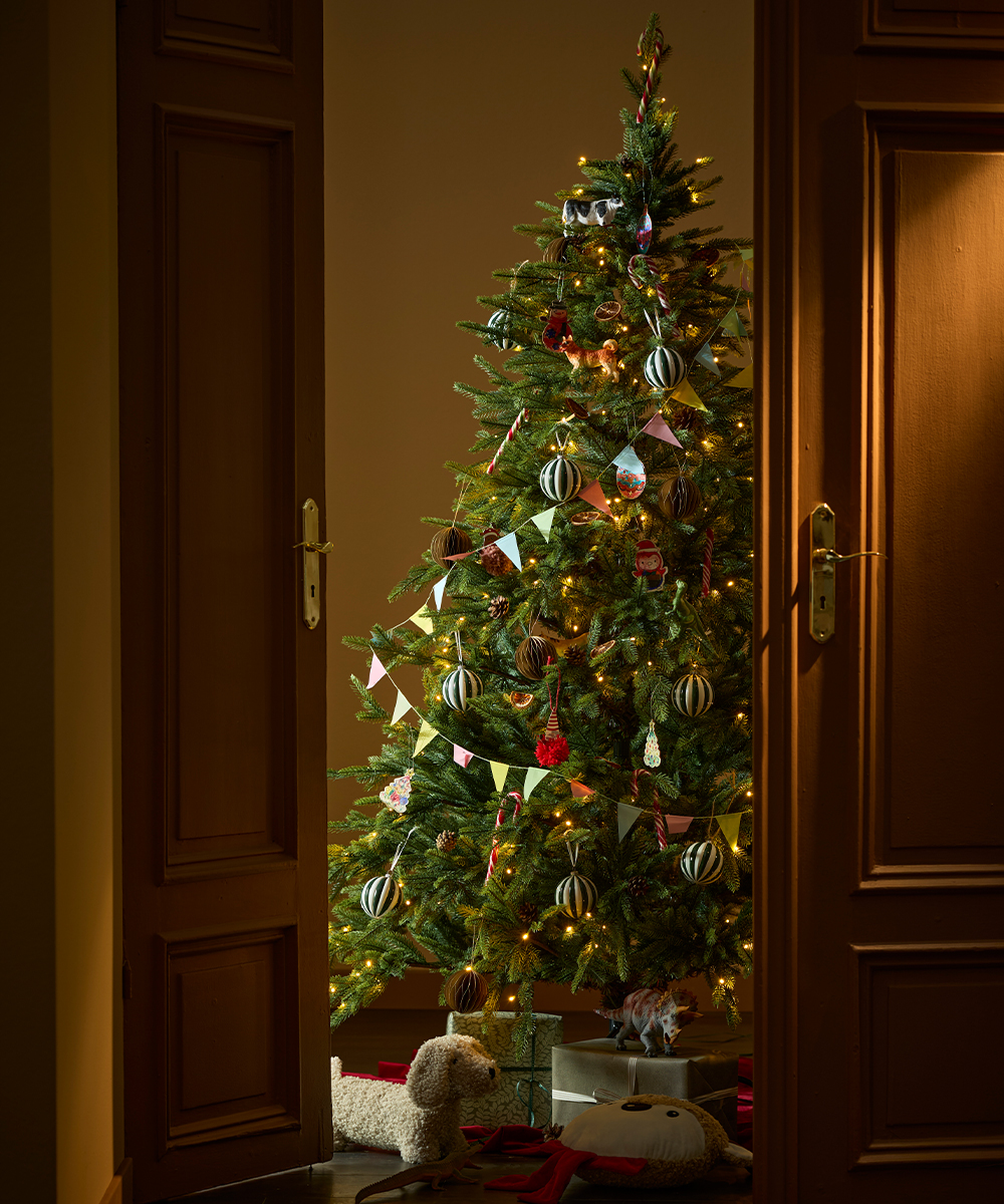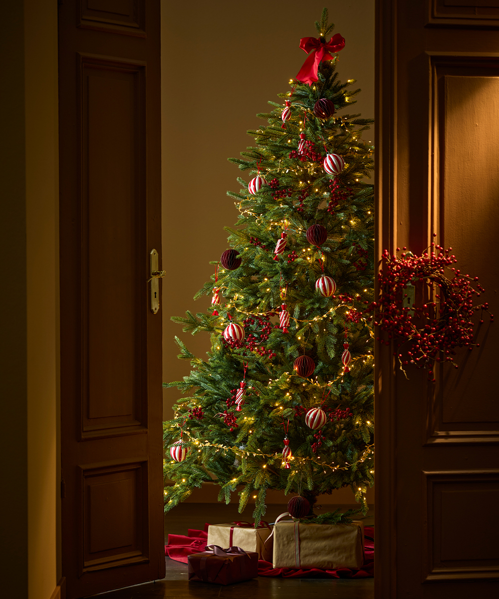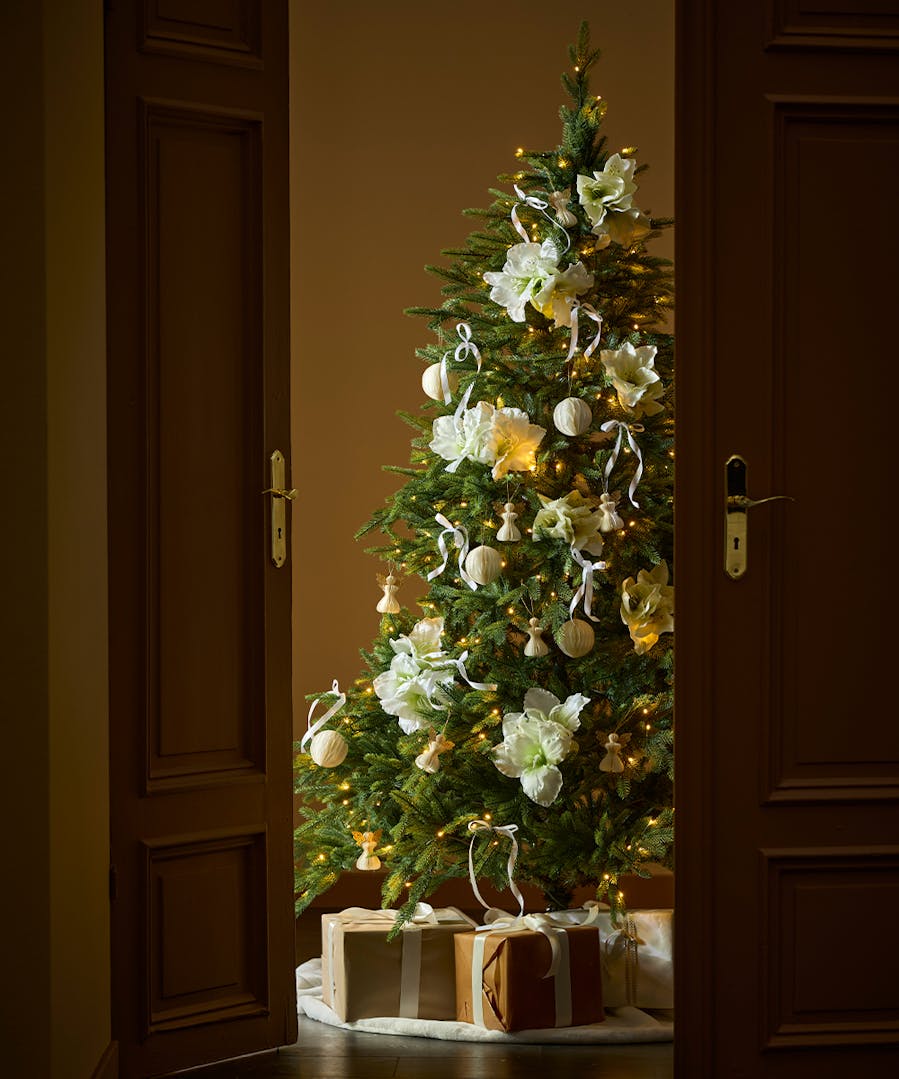 - Begränsa färgerna – håll dig till max tre nyanser och låt granen stå mot en lugn bakgrund så att dekorationerna får ta plats.