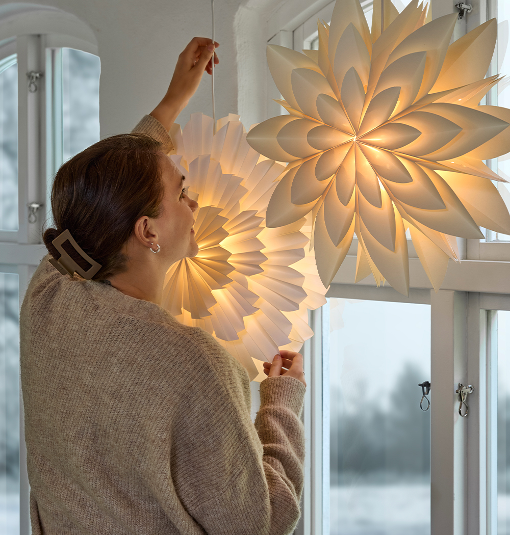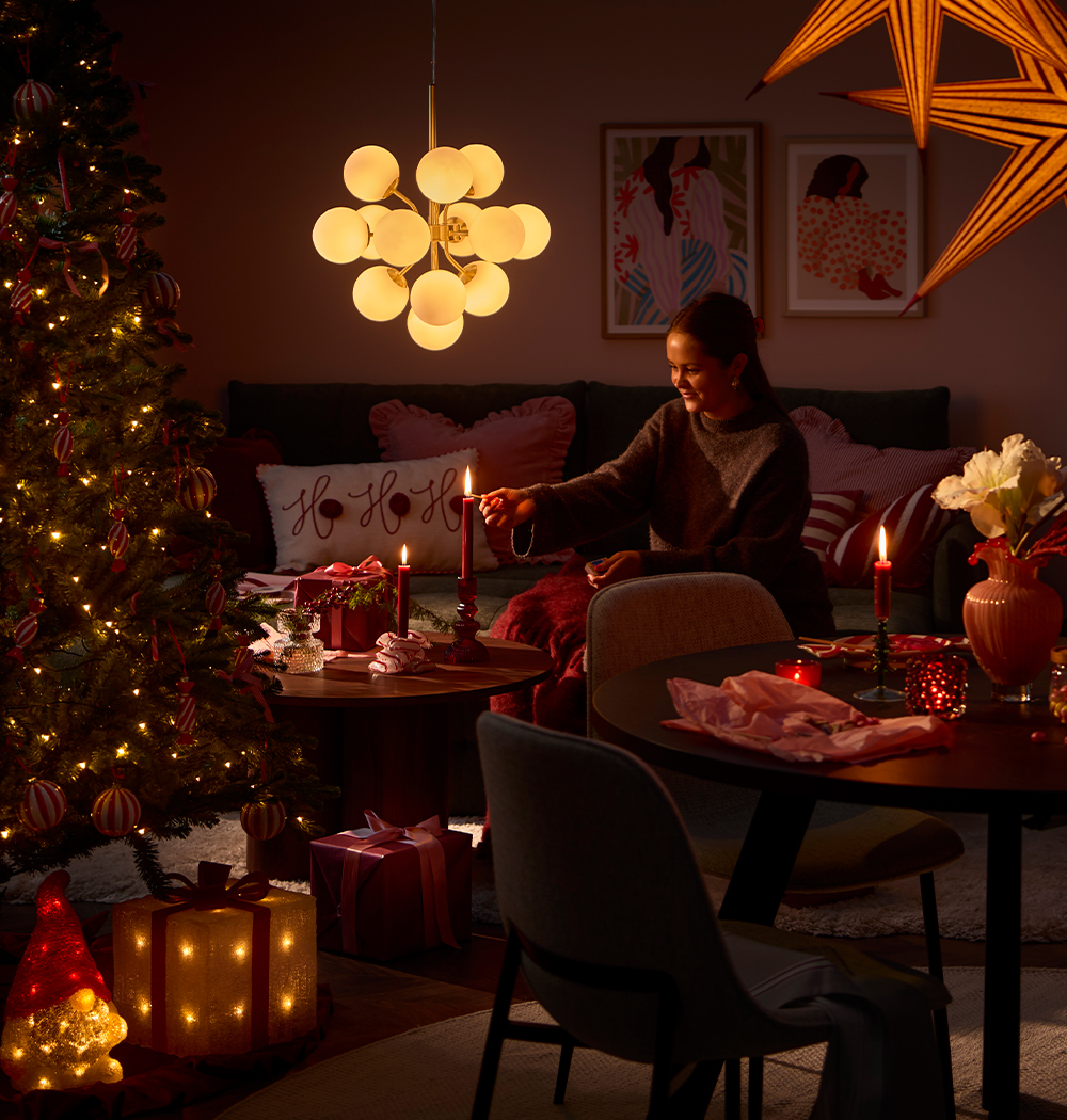 En tumregel? Tio ljuskällor per rum. Det låter kanske mycket – men när du räknar in taklampor, fönsterlampor, golvlampor, levande ljus och julens alla ljusslingor och stjärnor, inser du snabbt att det snarare är en perfekt balans.