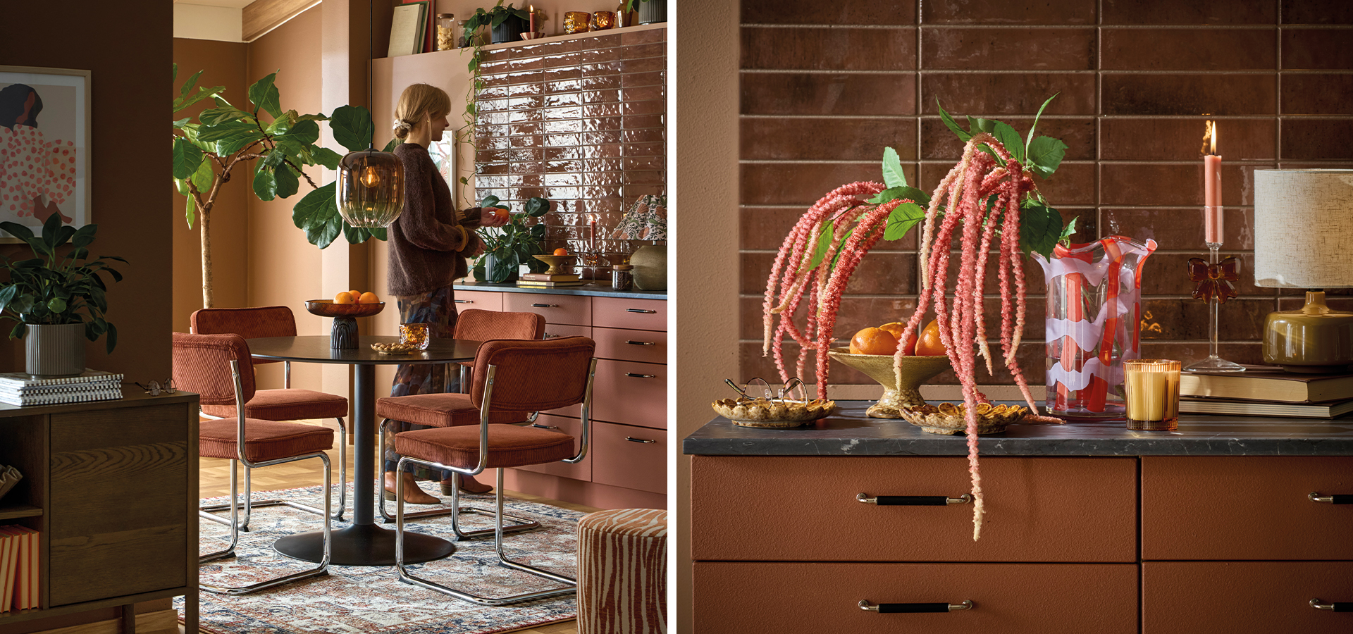 - Helhet med attityd. Låt stora gröna växter ta plats, kombinera med mönstrade textilier och belys i flera nivåer – det ger rummet liv, djup och en självklar retrokänsla.