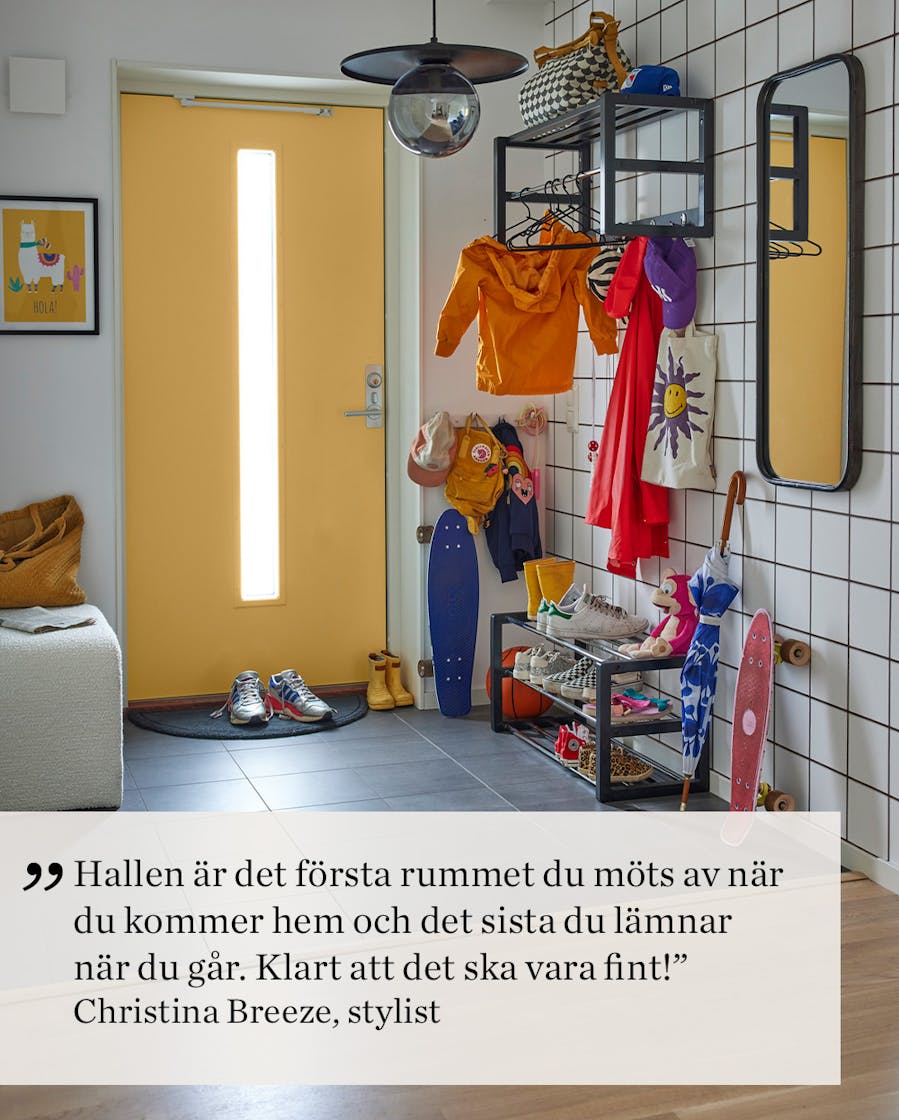 Det betyder mycket att hallen känns inbjudande och vem blir inte glad av en gul dörr?! Om inte alla bara ska slänga av sig jackorna på golvet är det bra med krokar i allas längder. Förvaring är den stora familjens bästa vän. Var ska annars gympapåsar, nyckelknippor och skolväskor ta vägen? Bygg på höjden för att få plats med så mycket som möjligt.
