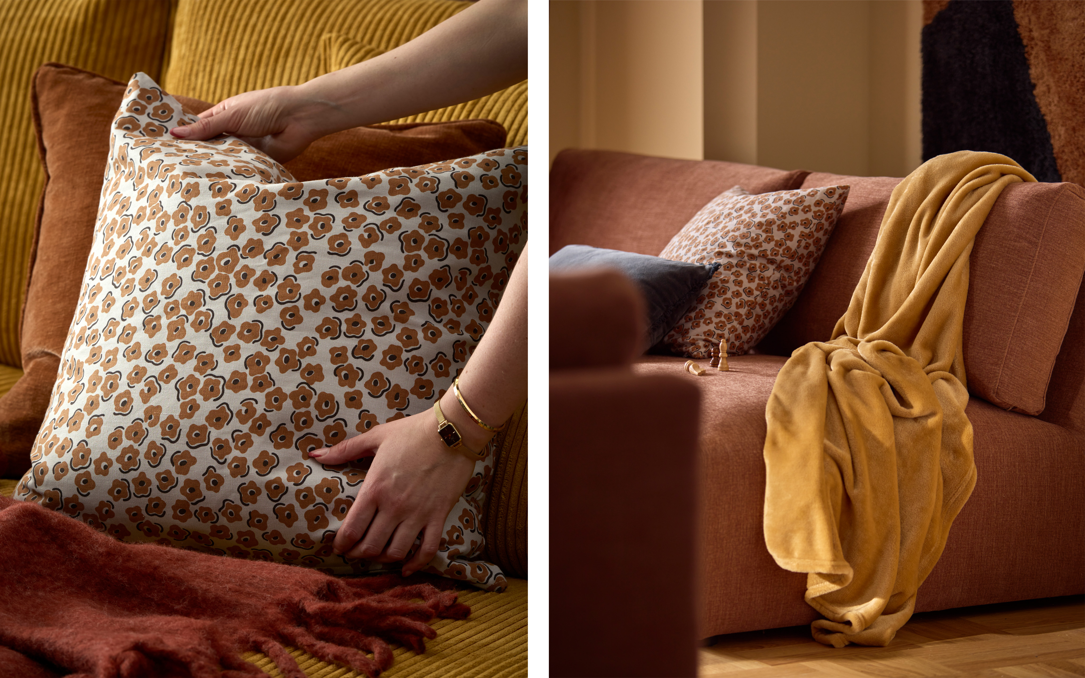 Ge soffan en höstig uppdatering med prydnadskuddar i varma, mustiga färger och plädar som bjuder in till mysiga kvällar. Bland våra höstnyheter hittar du säsongens finaste textilier – perfekta för att hålla värmen när höstkylan smyger sig på. Kombinera gärna olika färger och mönster för att skapa ett personligt hem i höst!