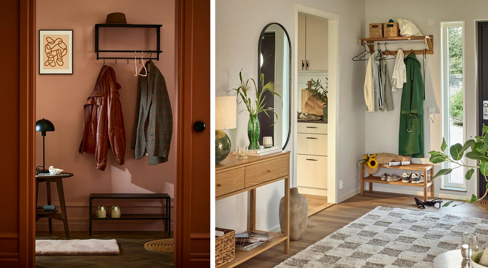 Att ha en välkomnande hall betyder mycket – både för dig och dina gäster. Har du inte plats för en garderob med galgar så fungerar det fint med tamburmajor, kroklist eller klädställ. Komplettera gärna med en liten byrå och ett skoskåp. Det är skönt att ha plats för bra-att-ha-grejer som nycklar och solglasögon samtidigt som du kan få undan det du inte använder dagligen.