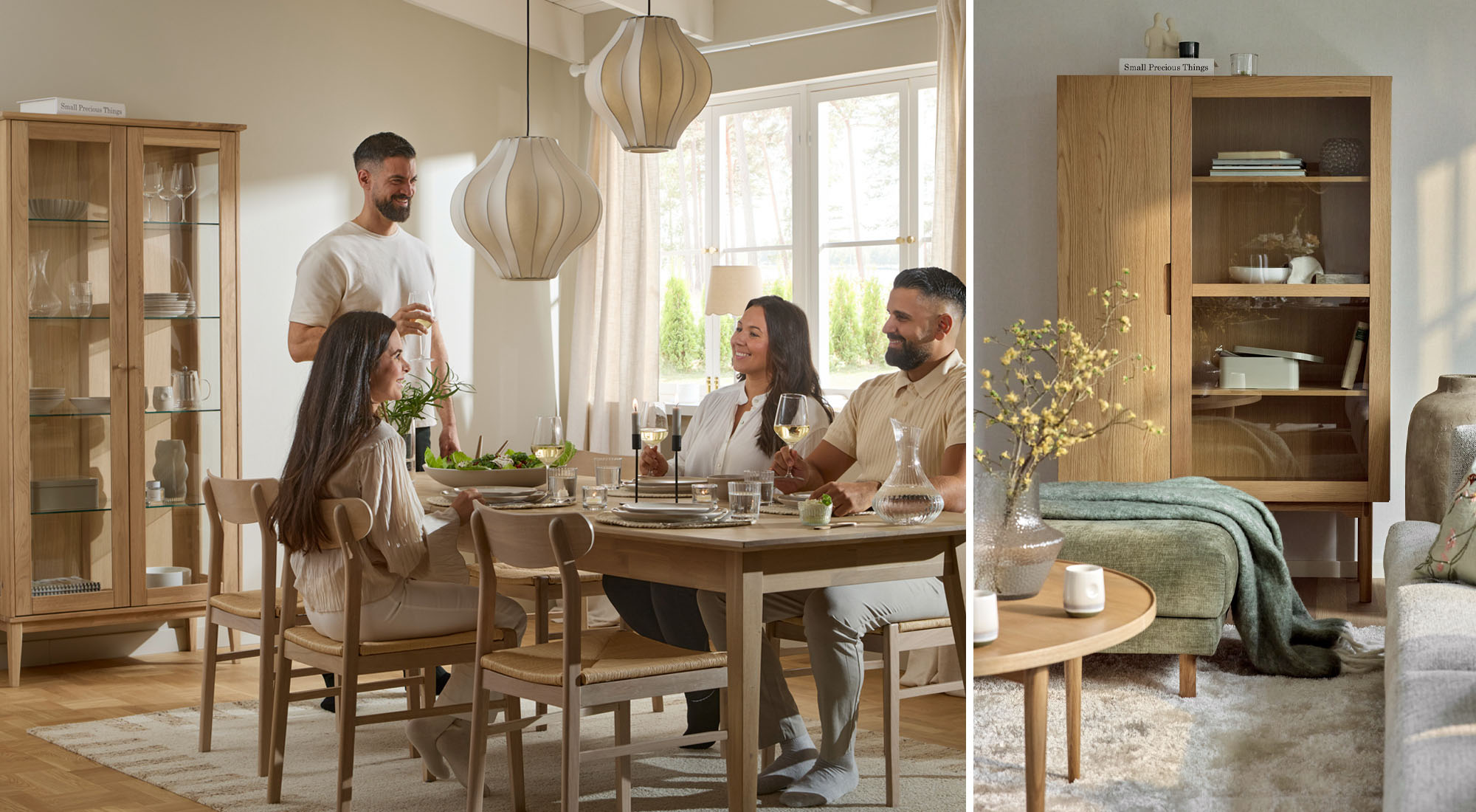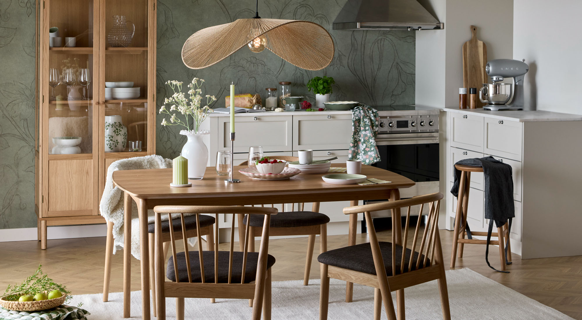 Matbord och stolar räcker långt men visst är det skönt med en skänk eller ett skåp där porslin, glas, ljus, servetter och annat får plats? Ett vitrinskåp är inte bara fint utan även smart på så vis att du ser vad som ryms i det. En extra twist blir det om du gör ett fint stilleben eller två som skymtar genom glaset. Samma sak gäller med ett sidobord eller avlastningsbord. Praktiskt att ställa saker på vid dukning och servering men också en snygg möbel som lyfter rummet.