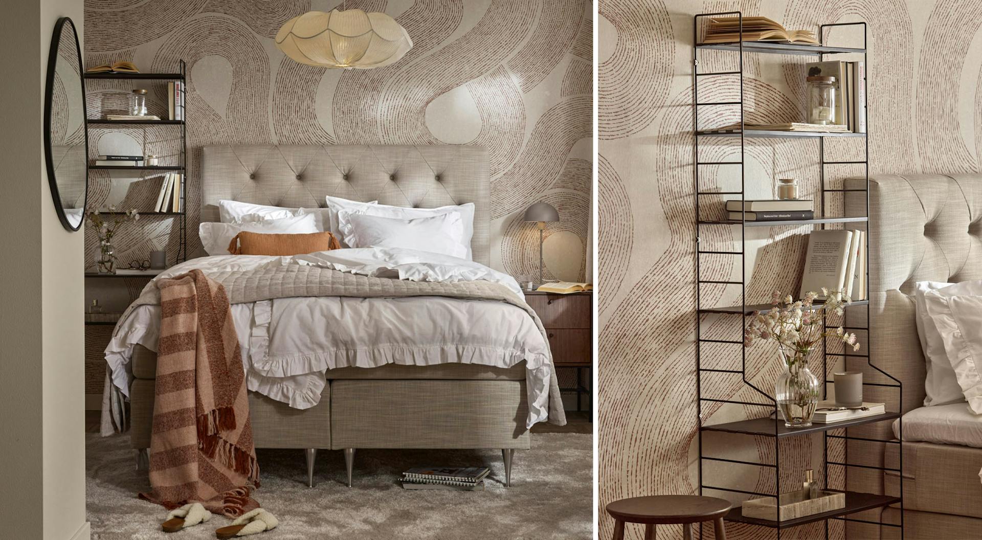 Skapa ett sovrum som utstrålar lugn och harmoni. Ordning och reda ger ro så satsa på bra förvaring. En rymlig garderob är guld värd. Addera en byrå, ett par sittpuffar med plats för förvaring i och en sittbänk att lägga kläder på. Många av våra sängar har dold förvaring – perfekt att lägga exempelvis sängkläder och extra täcken och kuddar i. Använd även väggarna till förvaring. Häng upp hyllor, tavellister, krokar och kroklister.