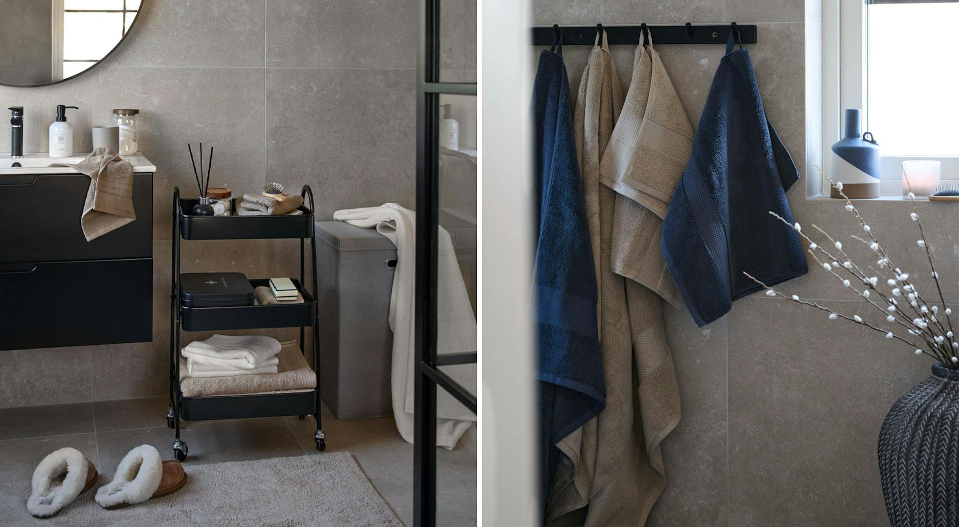 Många förvaringslösningar är både dekorativa och praktiska. Ett badrum blir snabbt rörigt om du inte organiserar smart. Förvara smycken, tops, smink, bomullspads och annat småplock i askar, korgar och burkar. De får plats i skåp, lådor och på fönsterbänken. Och glöm inte att använda väggarna till förvaring. Krokar ”slukar” mer än man kan tro! Andra tips är att lägga toalettpappersrullar i en fin korg, samla småflaskor i en vacker skål och ha dina favoritsmycken som du använder ofta framme på exempelvis ett litet fat.
