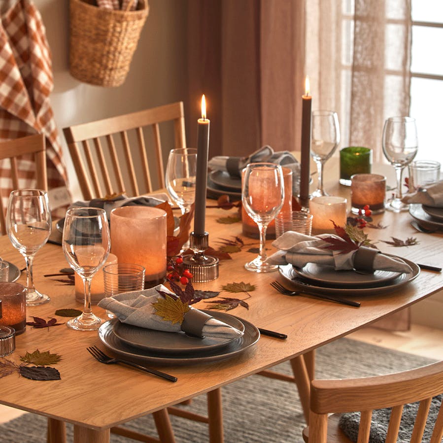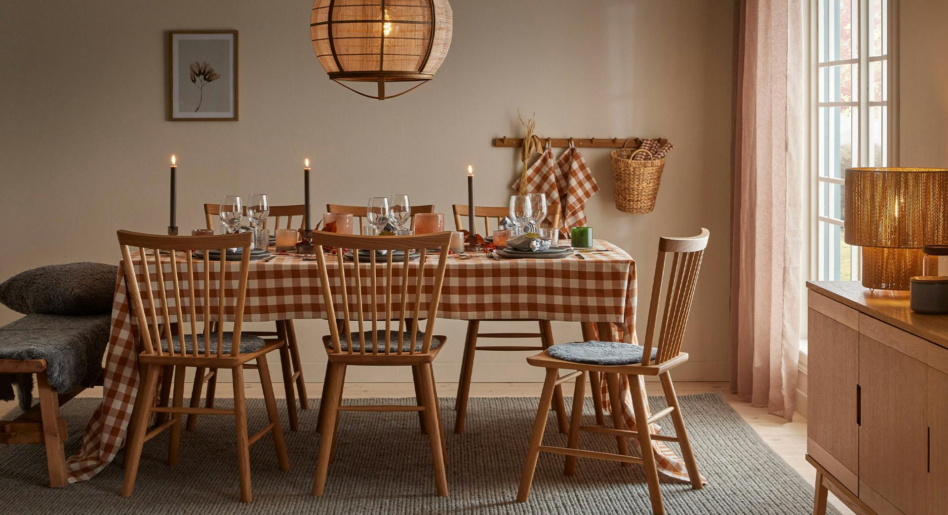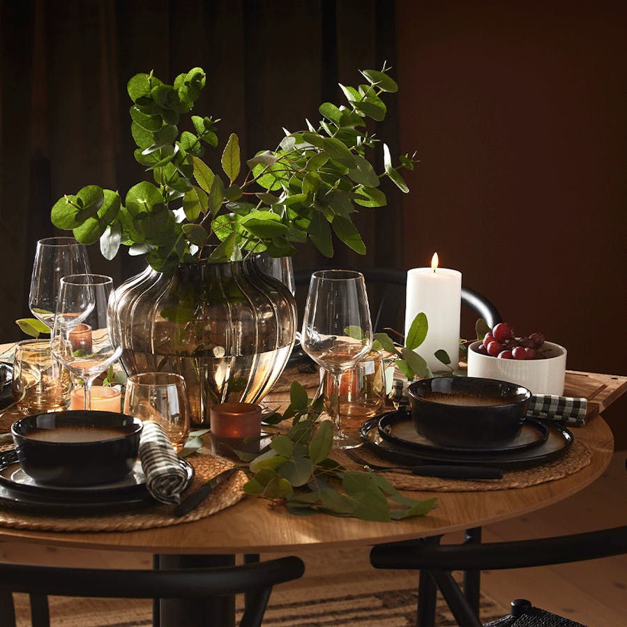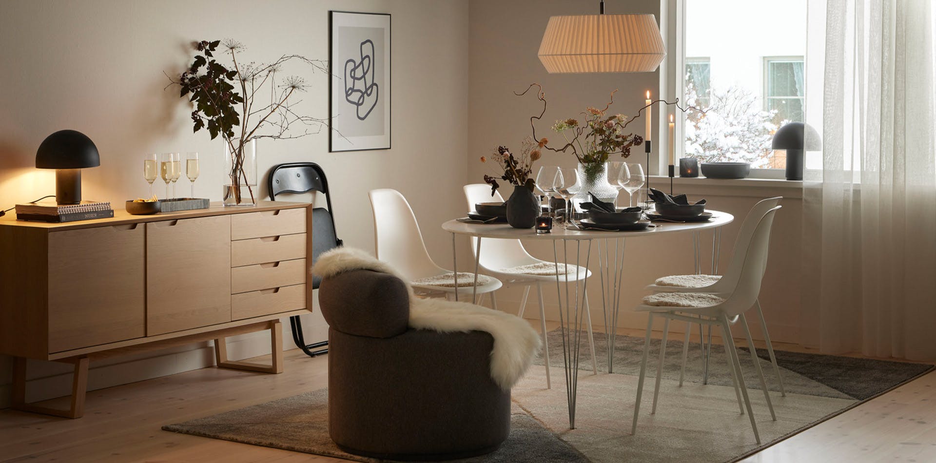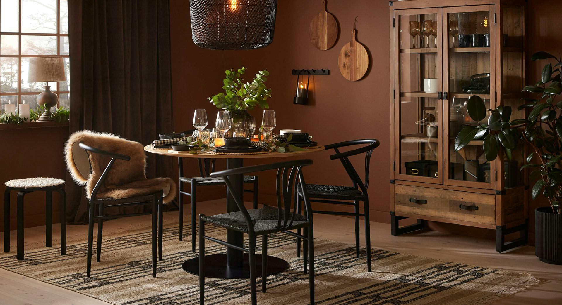Låt milda och ljusa färger få sällskap av svarta detaljer som bryter av fint. Få till en rustik och samtidigt elegant matplats med ett runt Plaine i ekfaner och pelarfot i svartlackerad metall. Det är enkelt att få plats med en extra stol eller två vid ett runt bord – med pelarfot finns det inte heller några bordsben i vägen!