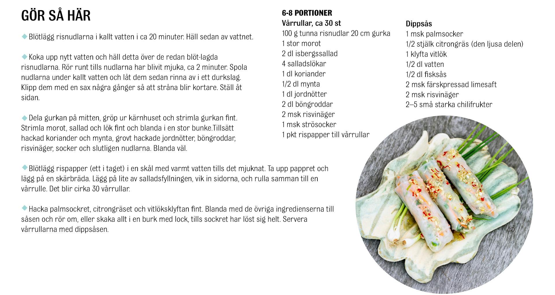 – Jag älskar dessa färska vårrullar, men det är dippsåsen som gör hela rätten. Inte nog med att det är gott, det är dessutom nyttigt. Skulle det bli lite dippsås över är den utmärkt att använda som smaksättning. Eller så sparar du helt enkelt såsen i en liten burk i kylen. Den håller i flera veckor.