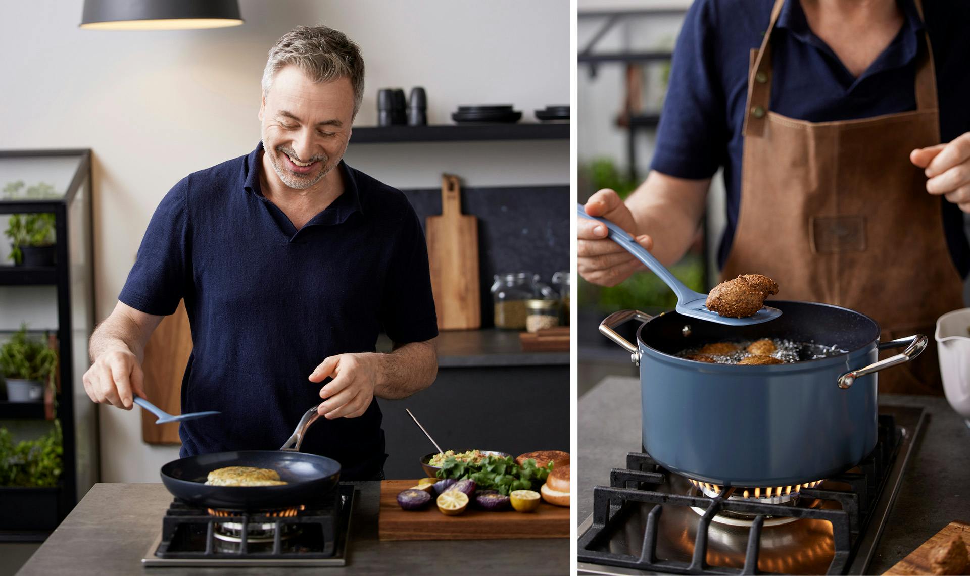 – Absolut inga PFAS-ämnen och plaster. PFAS är verkligen vår tids farsot. Vi använder istället Sol-gel som är en våtkemisk metod eller en keramisk beläggning i pannan som båda ger en mycket längre hållbarhet. Det är kiselolja i grunden som likt teflon ger en ”hal” funktion.