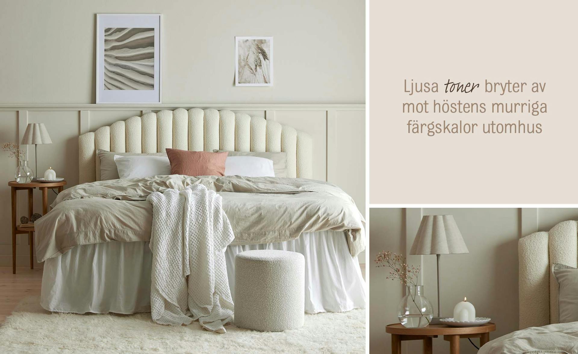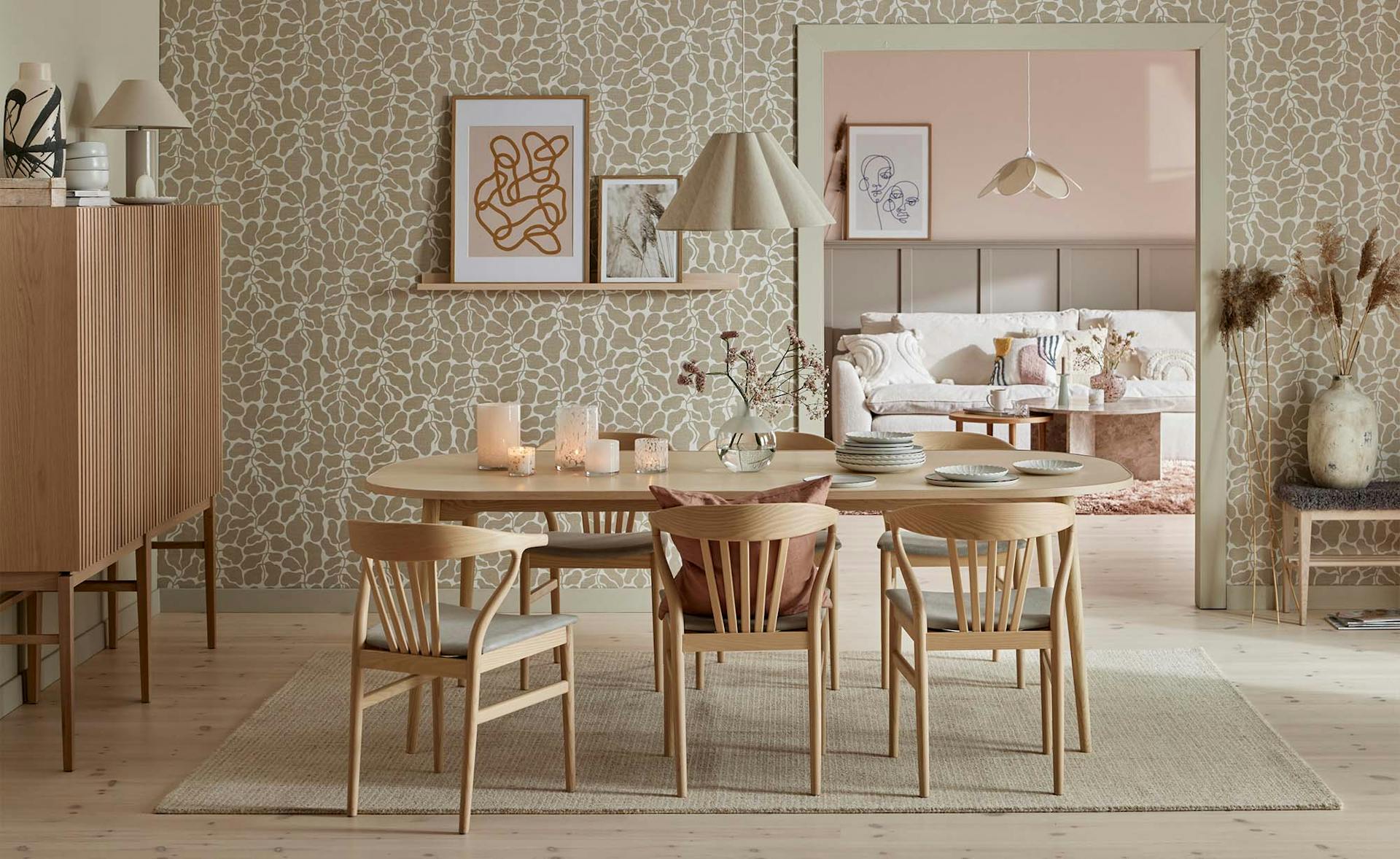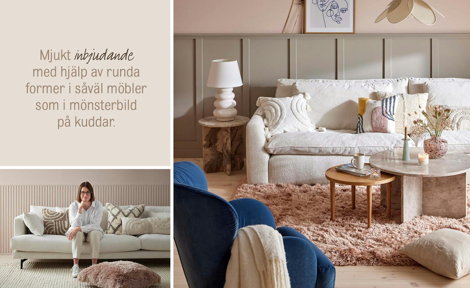 Utgå från den klassiskt skandinaviska stilen men våga blanda in oväntade färger och former. Låt det typiskt nordiska och de välbekanta naturtonerna få sällskap av pudrigt rosa tillsammans med ljusa terrakottafärger och en gnutta blått. Mjukt inbjudande med hjälp av runda former i såväl möbler som i mönsterbild på kuddar.