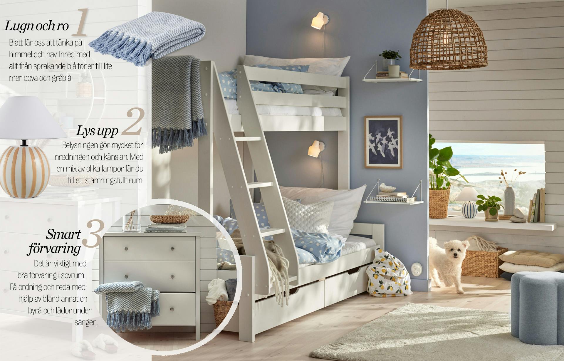 Skapa ett sovrum som utstrålar lugn och harmoni. Omge dig med färger från naturen, inte minst i sovrummet som ska vara ett rum för ro. Blå toner är kända för att sänka pulsen och stressnivån.
