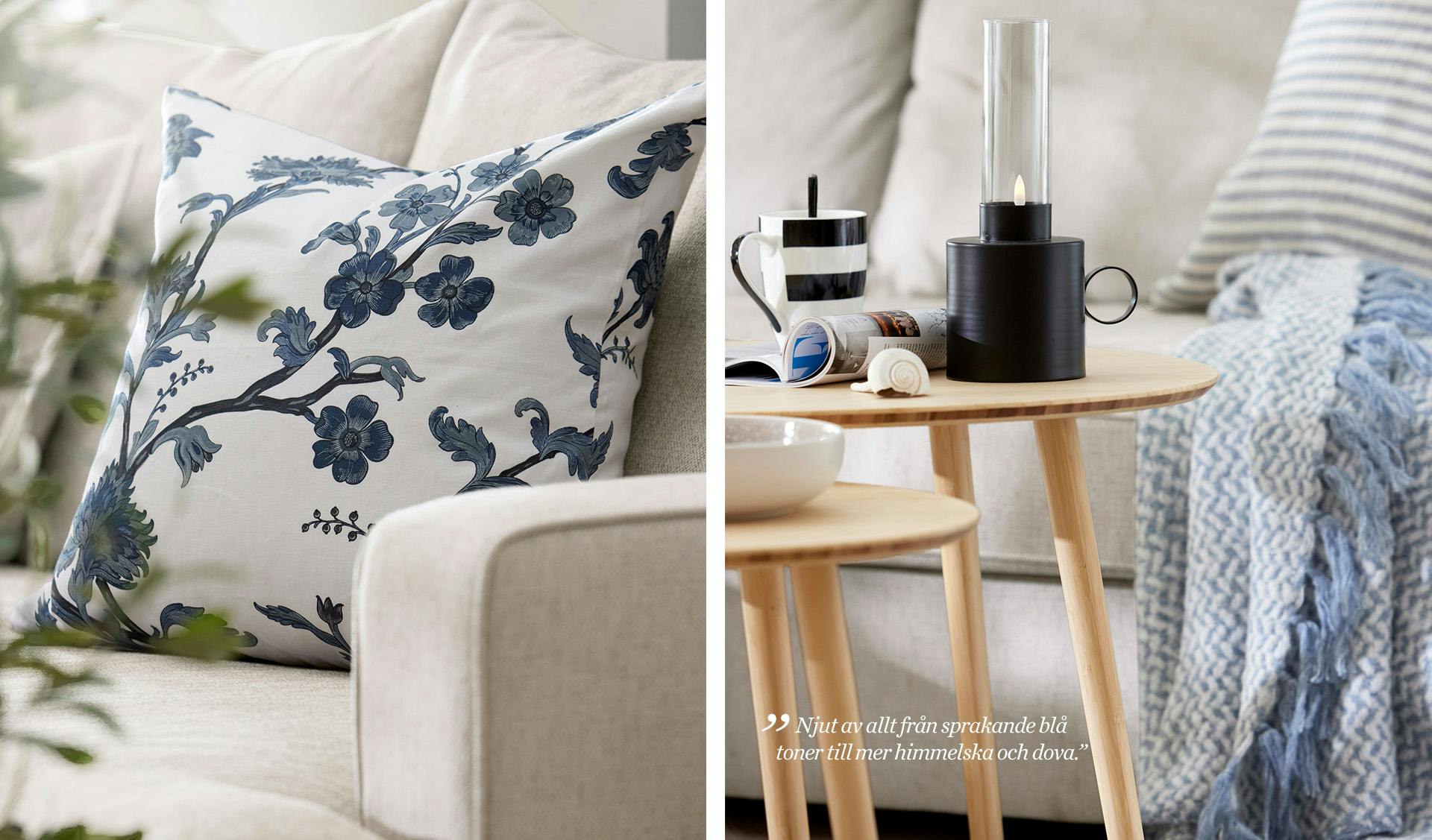 Blått är sommarens färg och får våra tankar att vandra till himmel och hav. Färgen associeras ofta med lugn och trygghet. Den hjälper oss att slappna av – precis som det ska vara när sommaren och semestern kommer. Låt hela livet gå i blått! Njut av allt från sprakande blå toner till mer himmelska och dova. Tänkt krispigt och somrigt. En vitaminkick som får även mulna sommardagar att lysa.