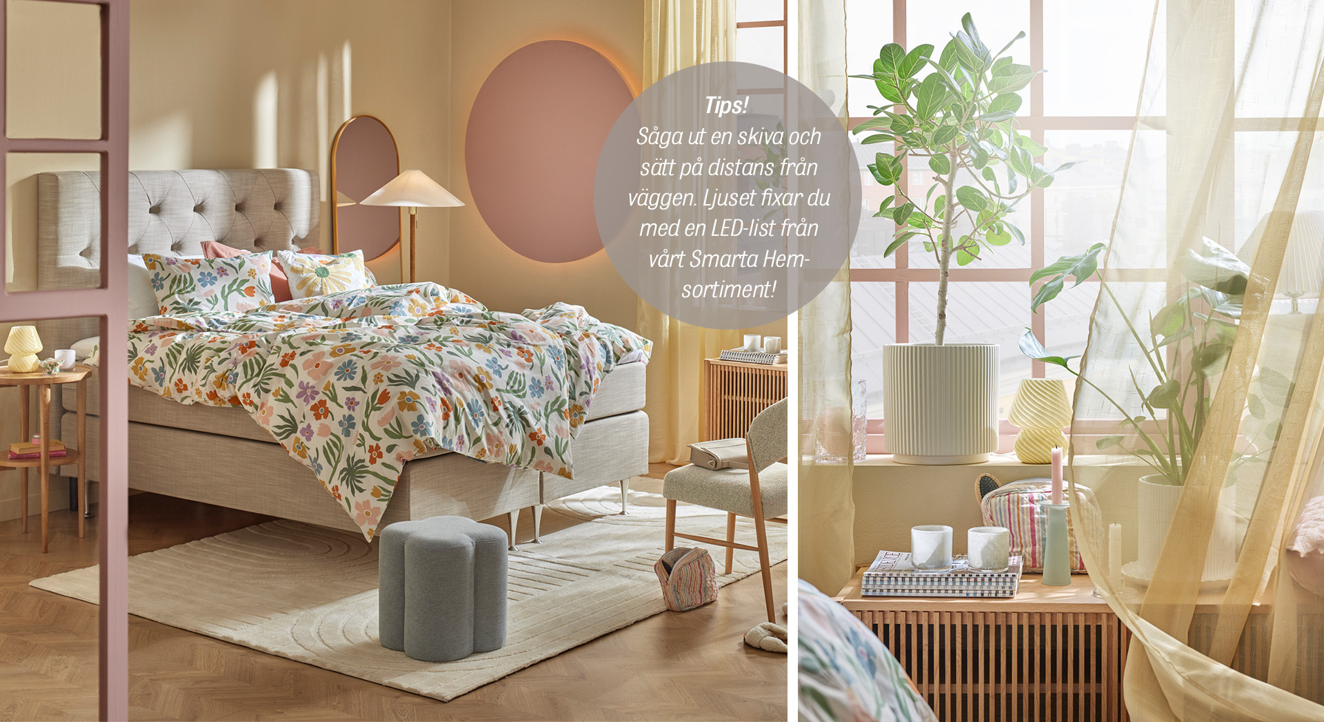 Skapa ett rofyllt rum med färger som gör dig glad. Sängkläder med mönster blandade med pastellfärger och dämpade inredningsdetaljer som ger en inbjudande och härlig känsla.