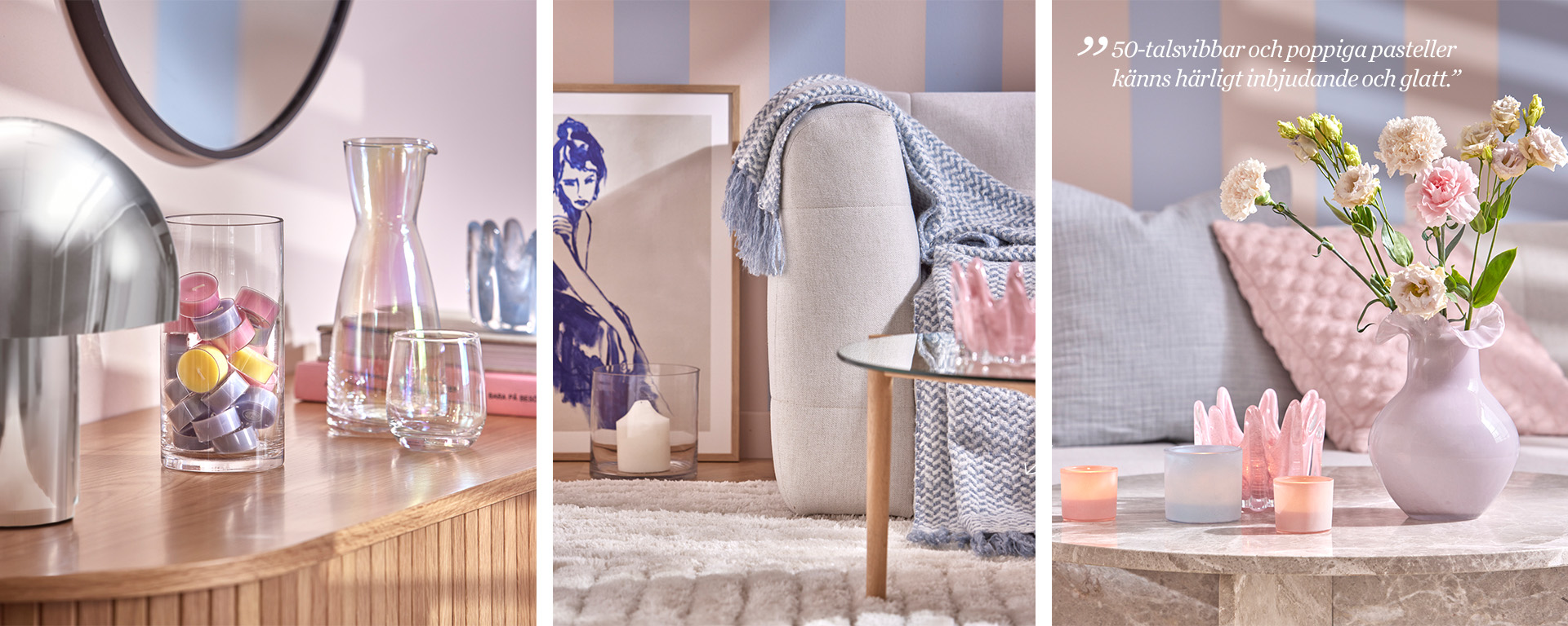 En blandning av retro, futurism, lek med mönster och sprakande färger ger en härligt naiv trend. Skapa ett bo av glädje med sol i hjärta, sol i sinne och med sköna semestrar i ditt minne! Rutor, ränder och blommor blir lyckopiller i hemmet där pastell- och 50-talstoner regerar. Allt detta bjuder in till att vara tillsammans, ha det bra och njuta av livet. Känner du doften av sommar, hav och sand?
