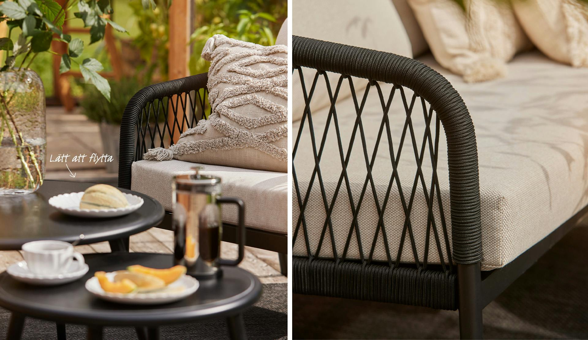 Smidigt att kunna använda växthuset som uterum när regnet faller eller vinden friskar i. Vädret kan ju växla om snabbt här på våras breddgrader. Modena har en bordsskiva i grått konstträ och ett underrede i vitlackerad aluminium. Även stolarna har en stomme i vitlackerad aluminium och en sits gjord av grå PVC-fri textilväv. Dynor finns att köpa till.
