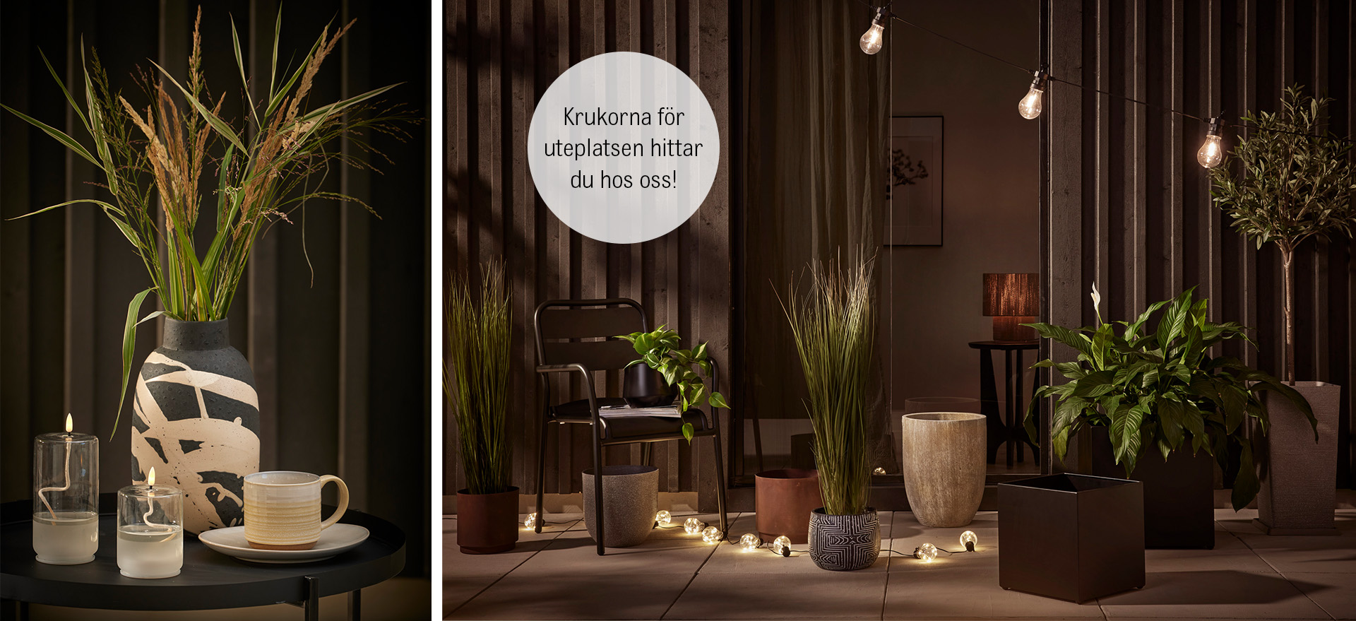 Låt vita eller naturfärgade utemöbler stå i fin kontrast mot en mörk fasad. Varför inte aluminium som är både snyggt och lättskött? Många faller även för konstrotting som ger ett naturligt och varmt uttryck. Addera mycket textilier och lite grönt i krukor och vaser!