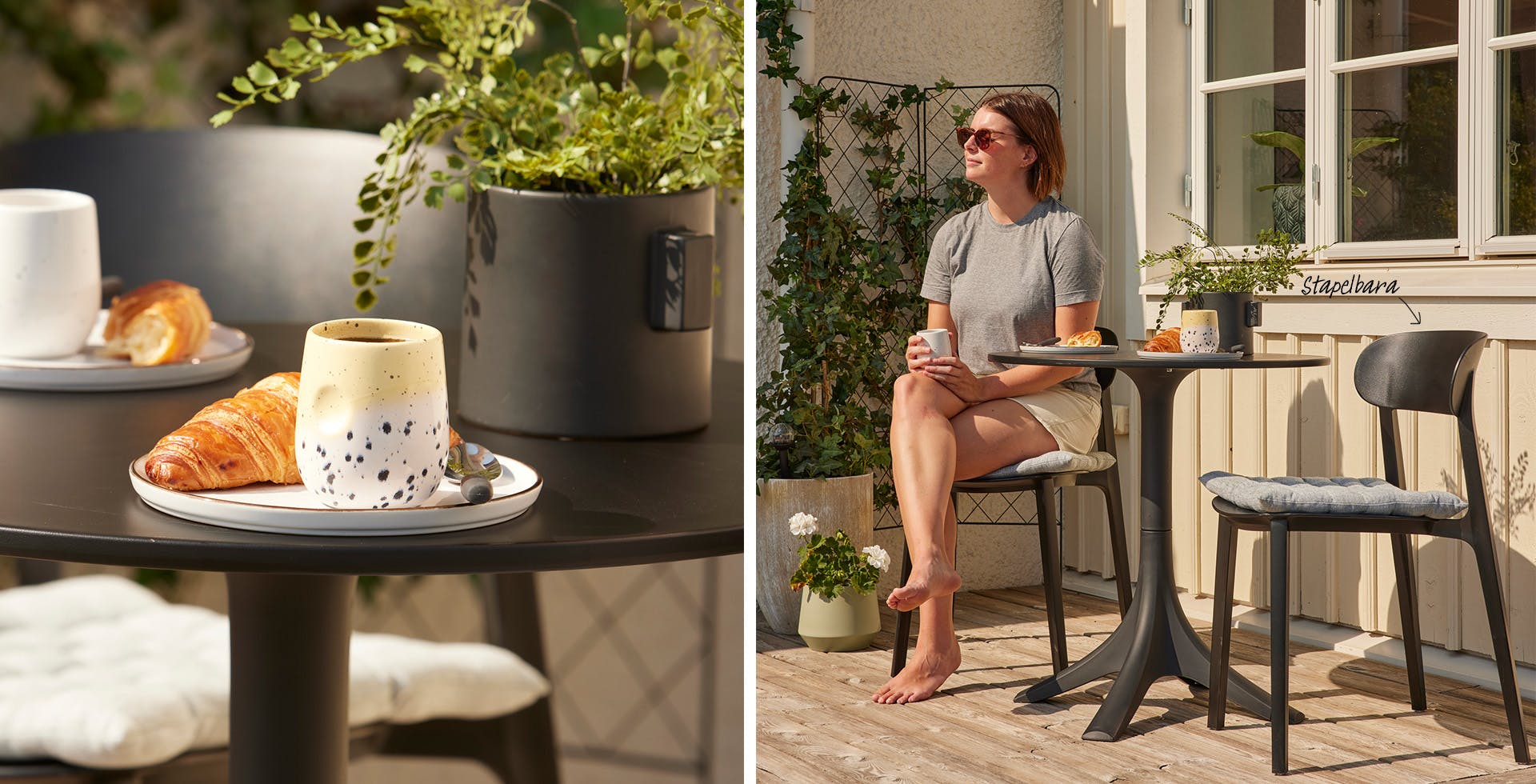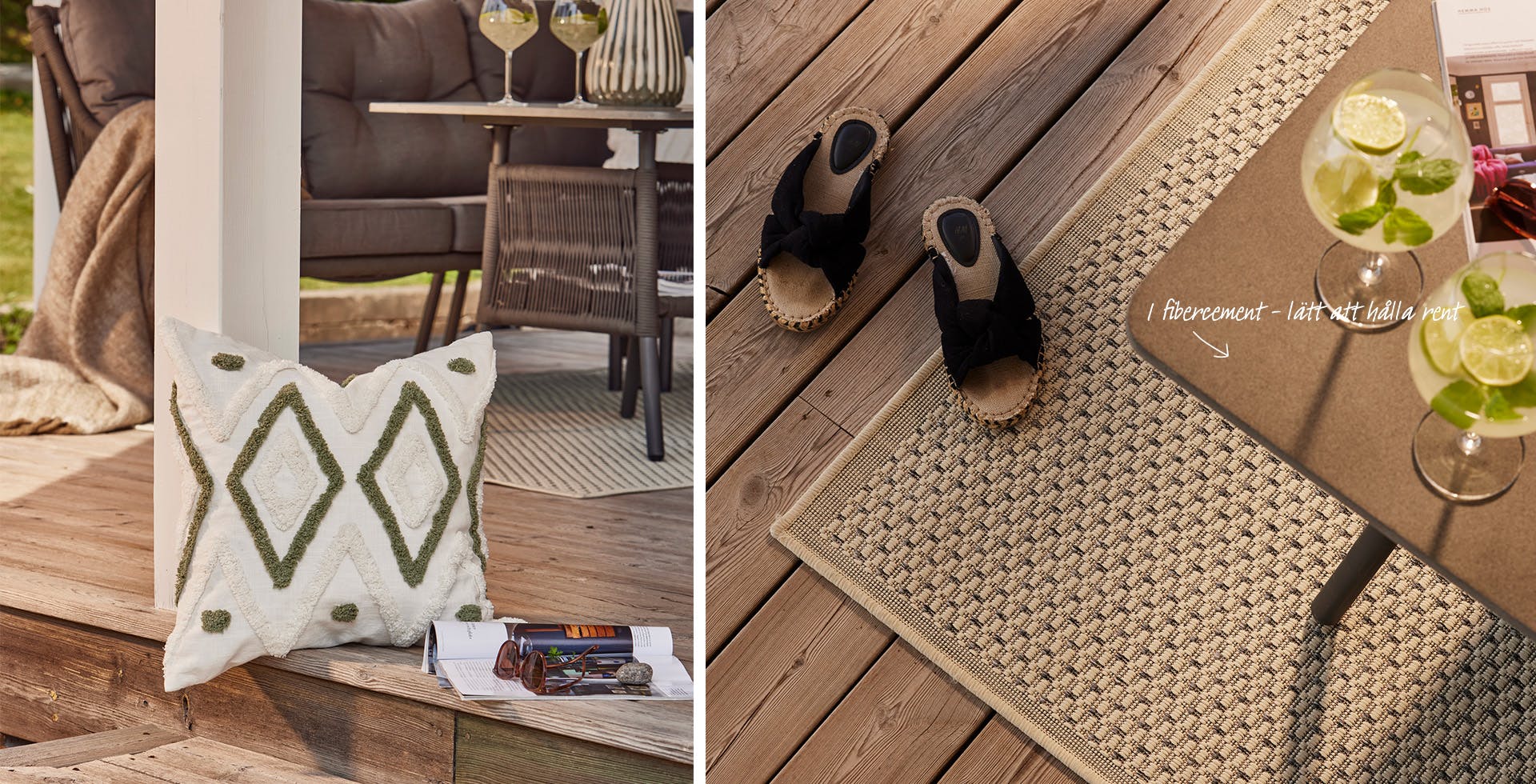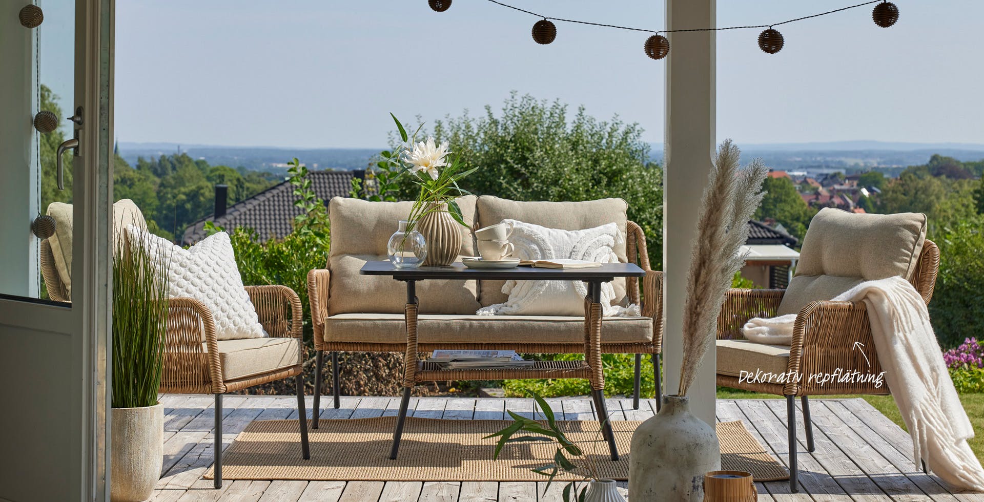 Konstrotting ger ett mjukt och varmt intryck. Inred din uteplats nära naturen med naturnära toner! När skymningen kommer och mörkret faller får du till en mysig stämning med dekorations- och solcellsbelysning.