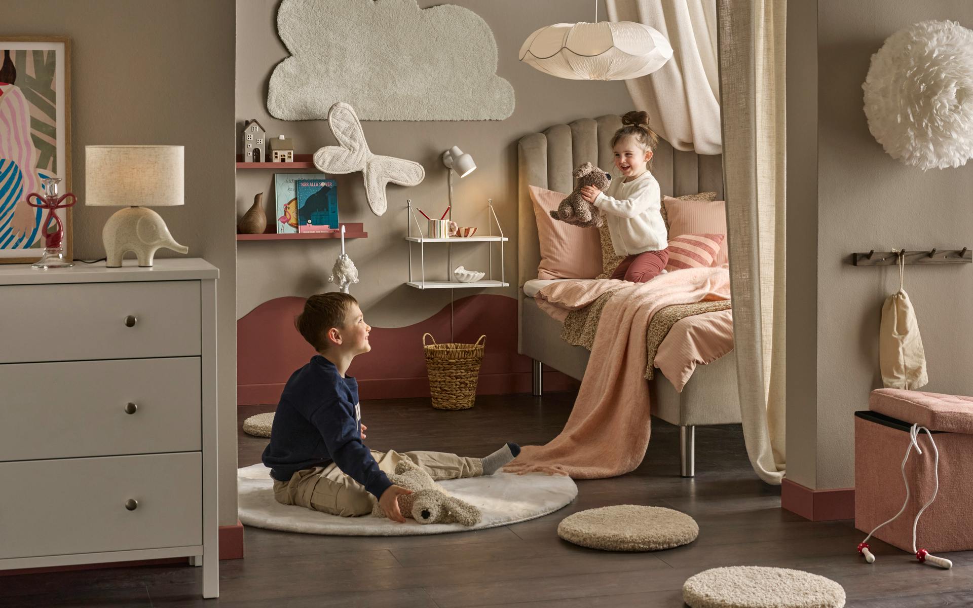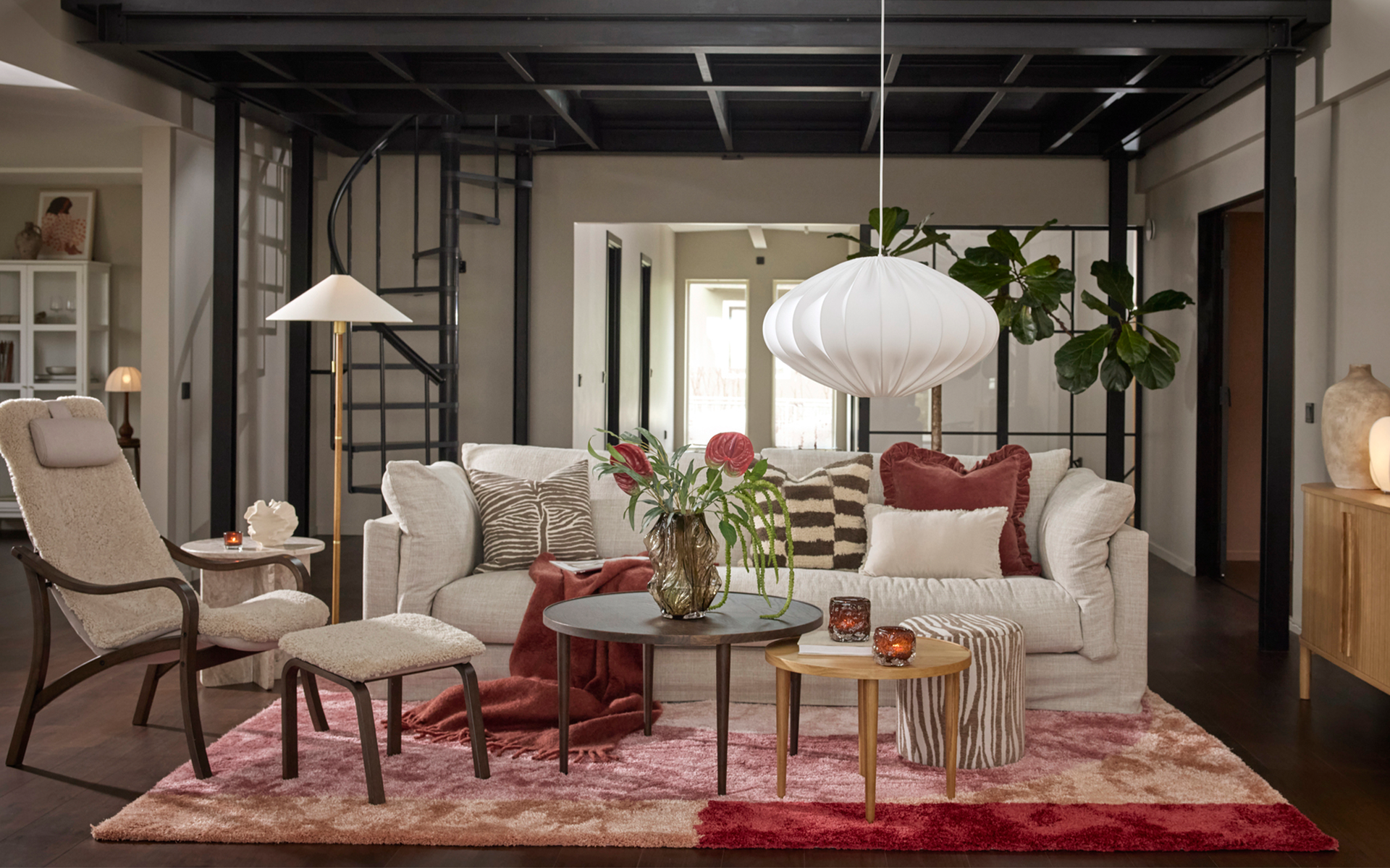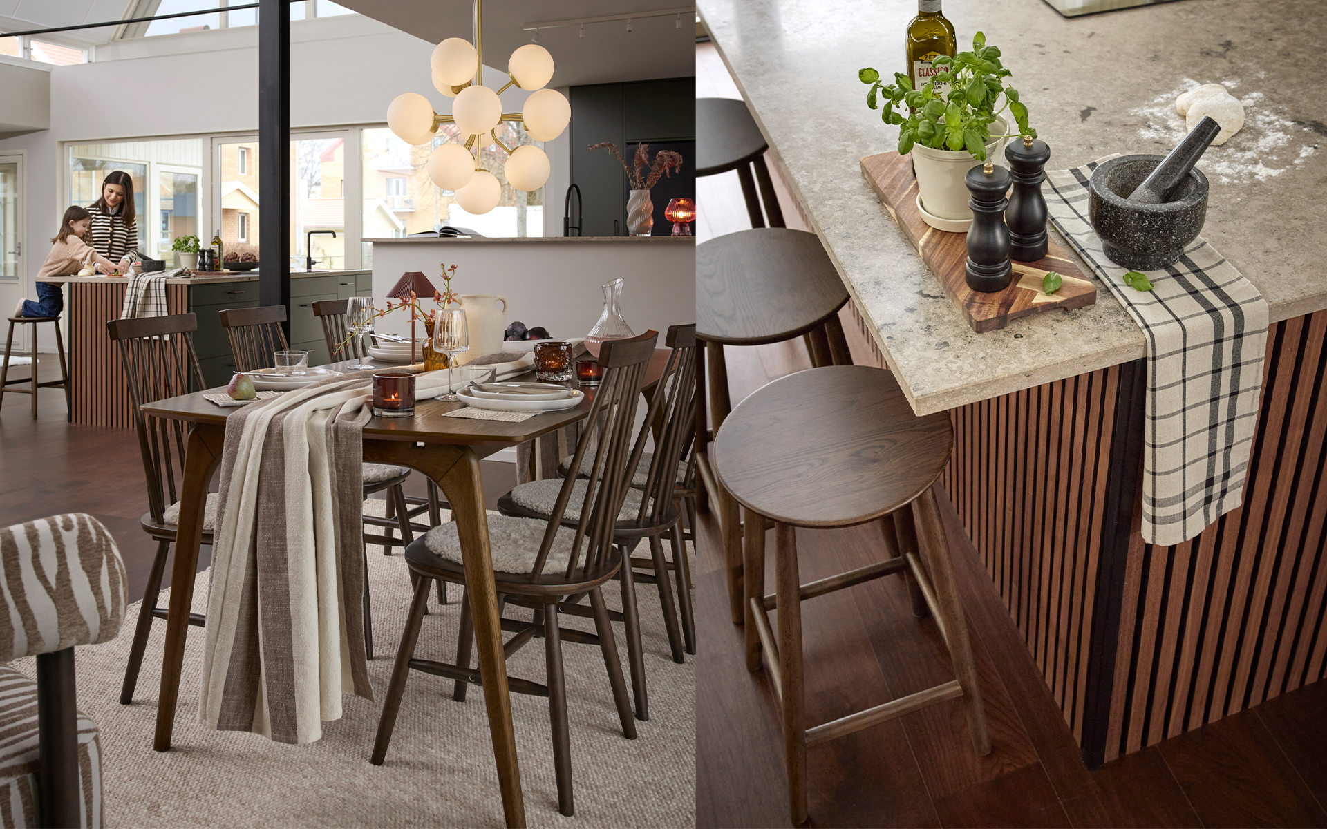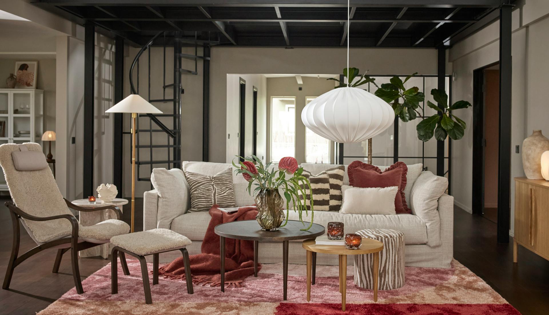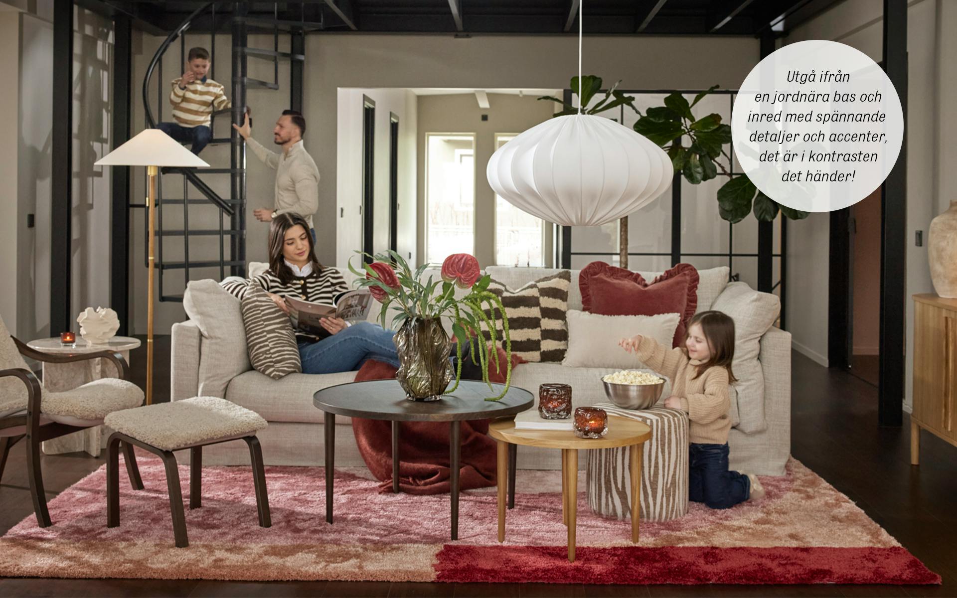 I ett hem där varje hörn bjuder in till närhet, skratt och personliga uttryck spelar vardagsrummet en viktig roll. Här möts linne, fårskinn och skandinaviska träslag i en varm och jordnära bas. Ek blandas med mörkare träslag och det stilrena får sällskap av oväntade detaljer som väcker nyfikenhet.