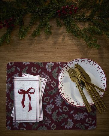 För den som vill skapa en enkel men ljuvlig juldukning har vi massor av inspiration att erbjuda. Vad sägs om att använda en bordslöpare i kombination med några juldekorationer? Skapa en mittpunkt med ljus, en vacker vas med julblommor, rönnbär, grankvistar och massor av glitter för att få ditt bord att gnistra. Med servetter i julens färger sätter du pricken över i:et på festligheterna.