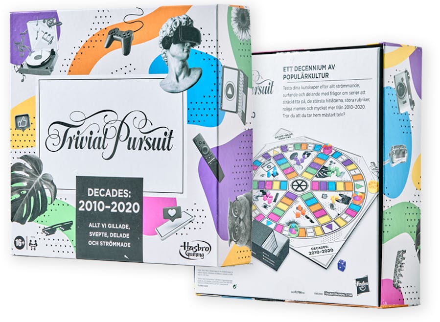 Trivial Pursuit Decades 2010-2020 är spelet där ni testar era kunskaper om årtiondets populärkultur. Frågorna innefattar allt från hitlåtar och filmer till virala memes och de största nyhetsrubrikerna. Spelet innefattar sex roliga kategorier – Spellistor, Sevärt, Nyhetsuppdatering, #Kultur, Krascha internet och Spelet kan börja. Här finns frågor som passar alla, och som dessutom bjuder in till såväl samtal och minnen som till aha-upplevelser.