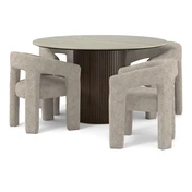 Astrid bord med keramisk skiva och ekfaner erbjuder hållbar stil. Beige bouclé karmstol lägger till trend och komfort.