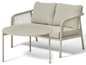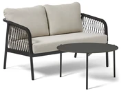 Denna lättskötta utesoffa i lackerad aluminium med elegant repflätning är idealisk för balkongen eller den lilla uteplatsen. Gruppen kompletteras med utebordet Domino, Ø80 cm, som har en stomme i lackerad metall för en stilfull helhet.