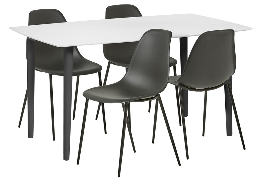 Vitlackerad mdf med ben i svartlackerad metall, stol i svart plast med ben i svartlackerad metall