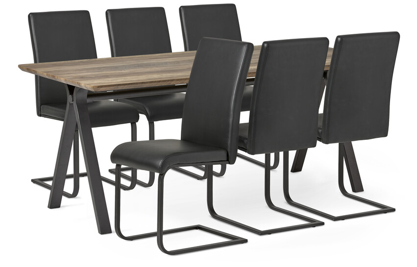 Trämönstrad melamin med underrede i svartlackerad metall, stol i svart konstläder med underrede i svartlackerad metall