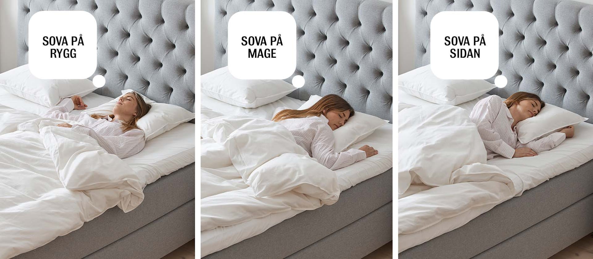 Utgå från dina sovvanor och behov. Vilken sovställning du har spelar stor roll i valet av säng. Låt oss guida dig till rätt komfort, bäddmadrass och även täcke och kudde.