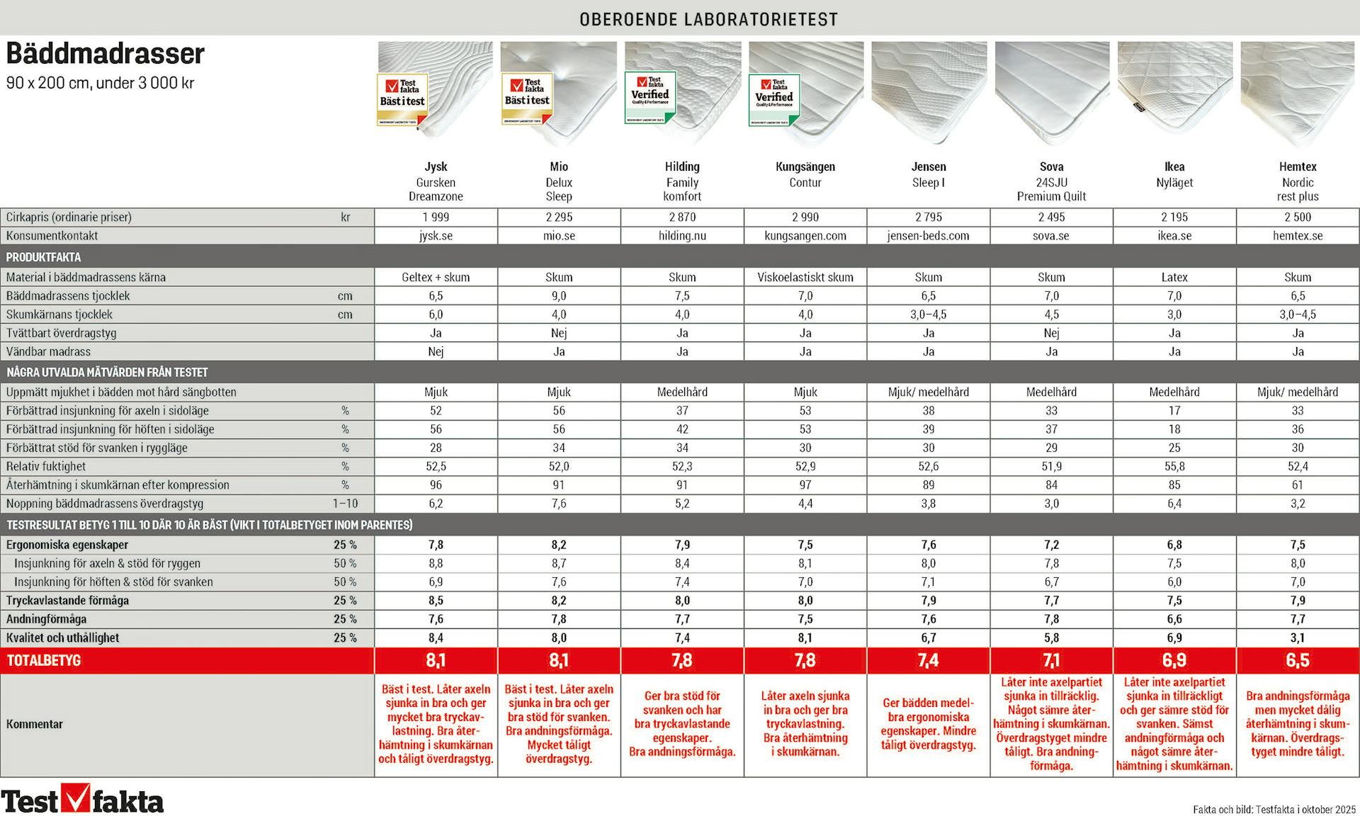 I ett oberoende laboratorietest utfört av Testfakta utsågs Delux Sleep till bäst i test, tack vare sin genomtänkta konstruktion och höga kvalitet. Testfakta lyfter särskilt att madrassen anpassar sig efter kroppen och ger stöd åt både axel och svank. Den har mycket god andningsförmåga, vilket bidrar till ett behagligt sovklimat hela natten. Överdragstyget är dessutom mycket tåligt och står emot slitage väl – en viktig egenskap för långvarig komfort.