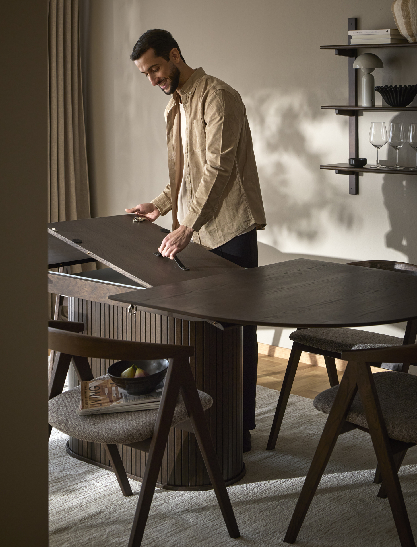 När det väntas många kring bordet finns iläggsskivan på 50 cm att ta till. Den förvaras mycket praktiskt under bordsskivan och är lätt att lägga i på egen hand.