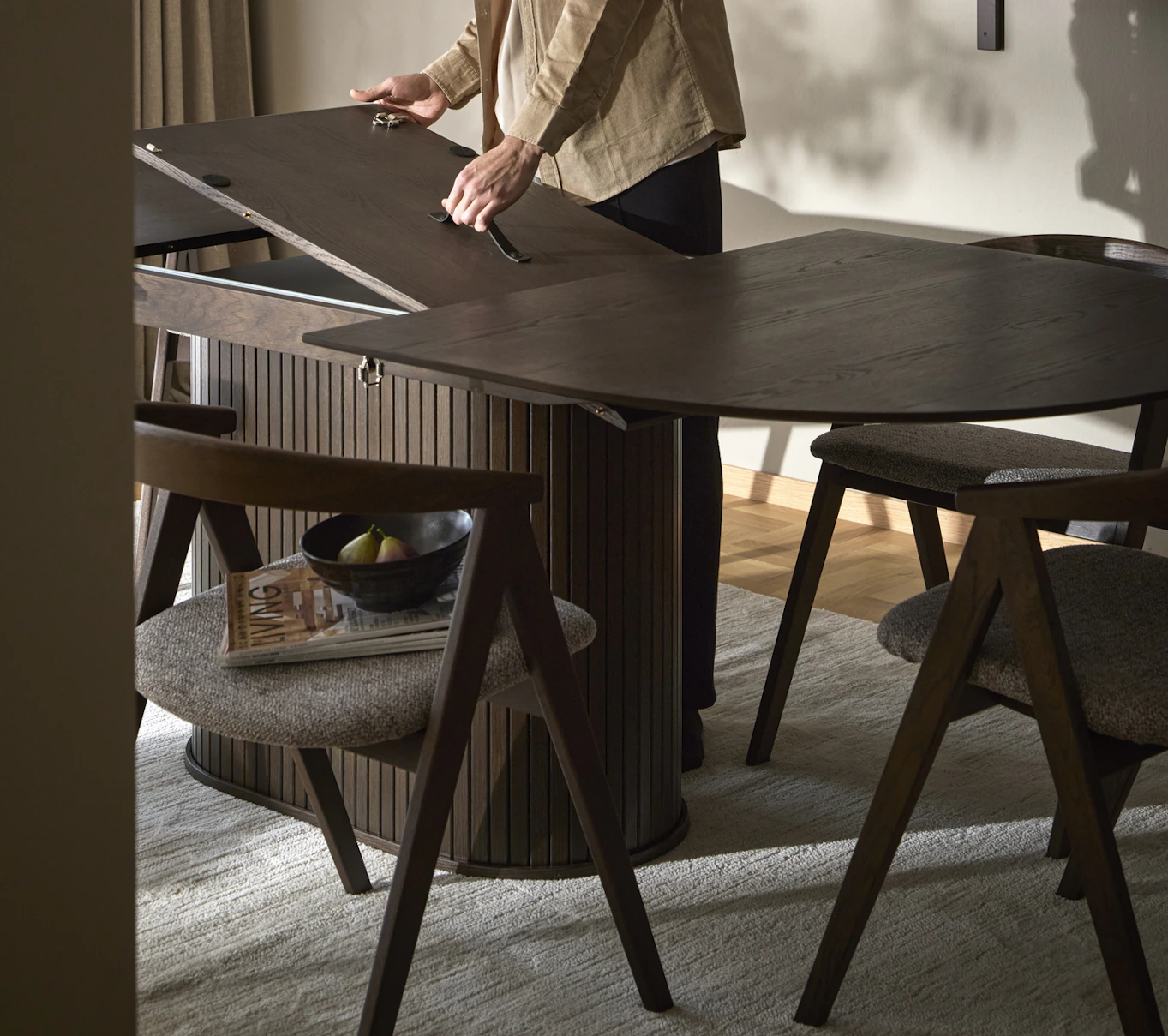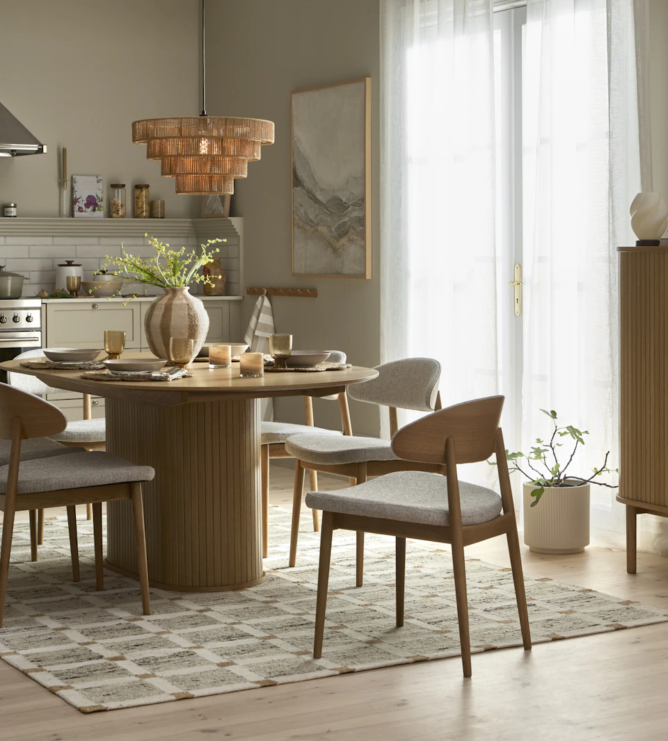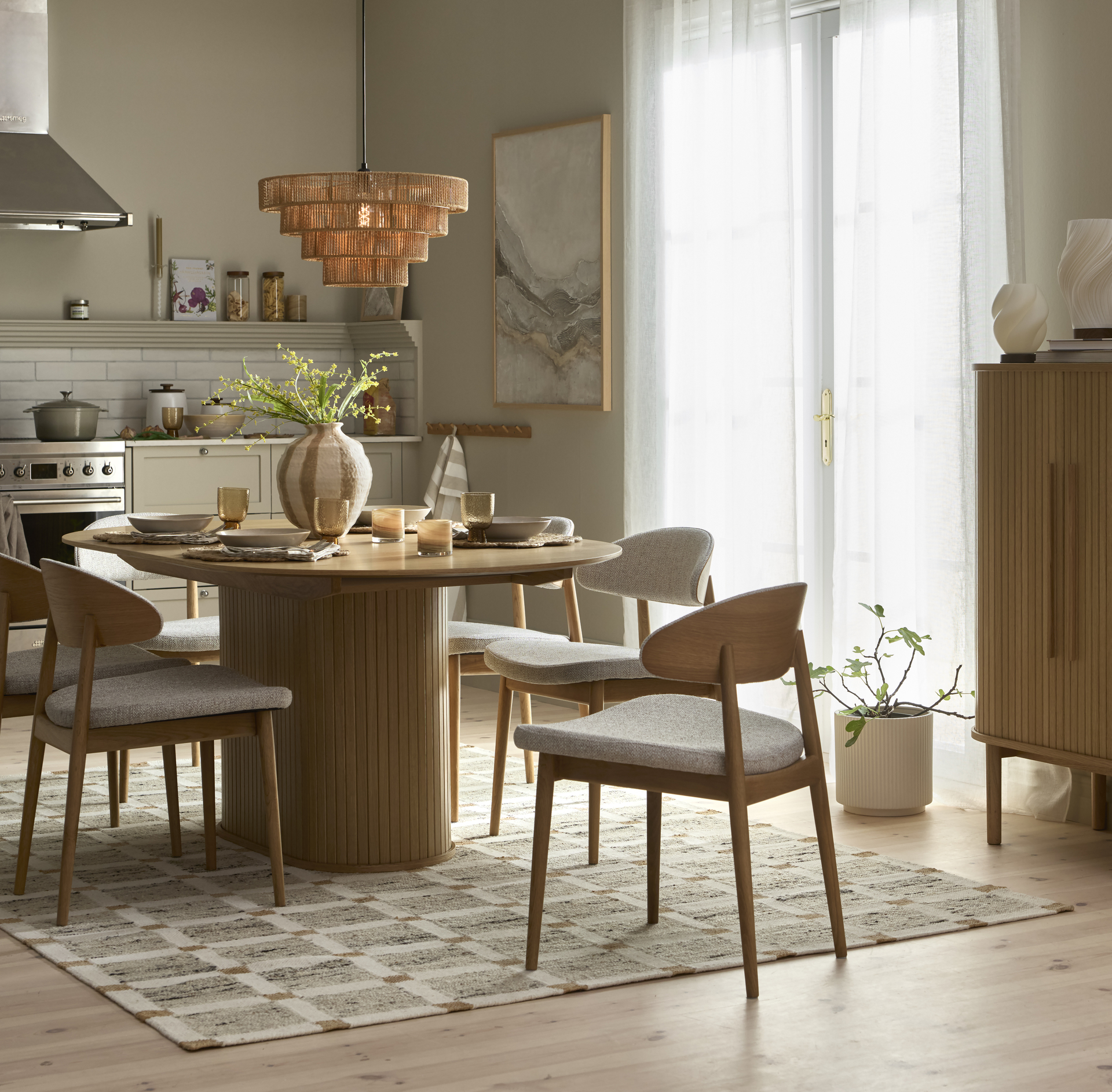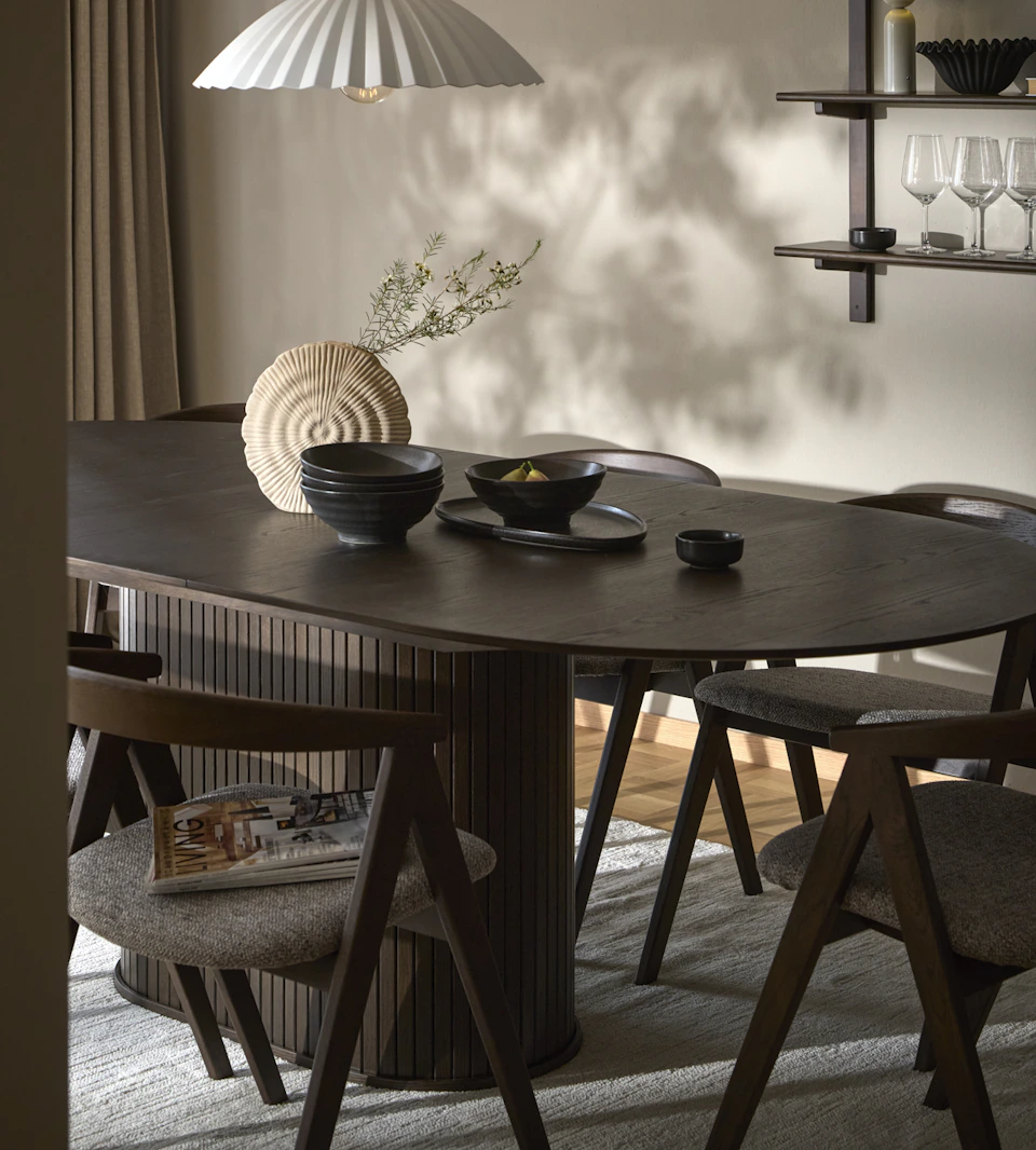 Judit är matbordet där umgänge och design står i fokus. Den ribbade pelarfoten och ovala formen är inte bara snygga detaljer – de gör också att ni kommer närmare in i gemenskapen och vill stanna till bords för många långa middagar.