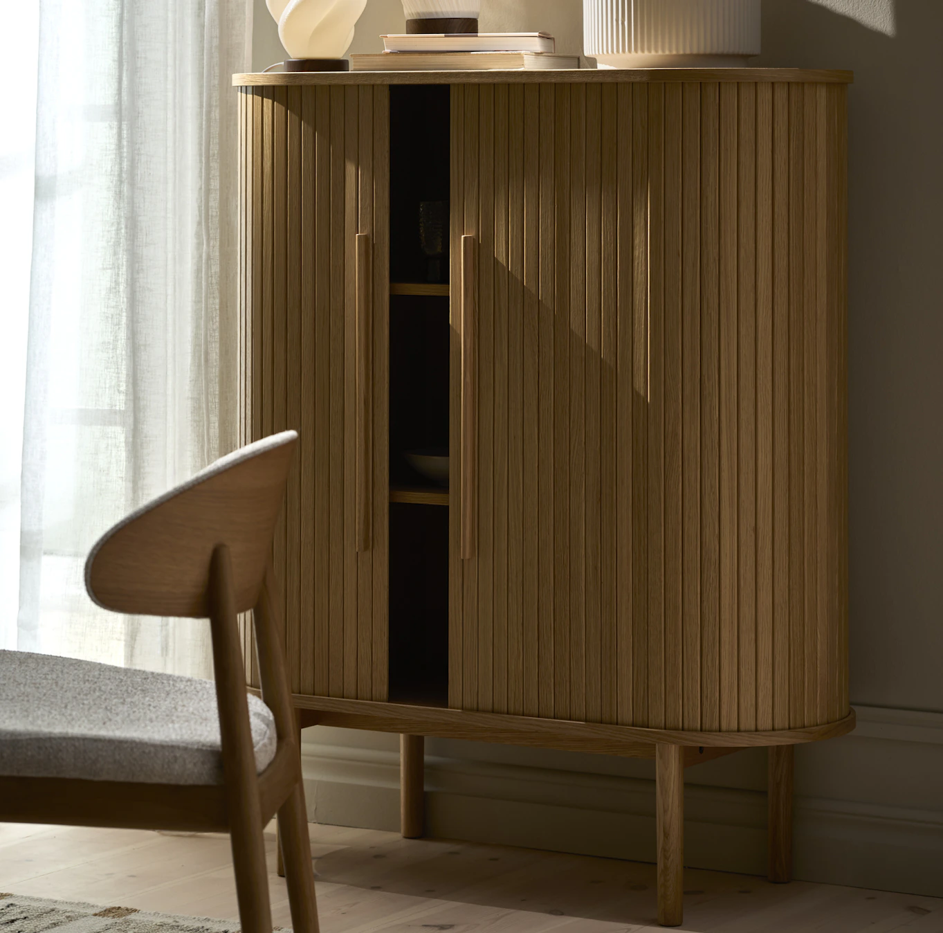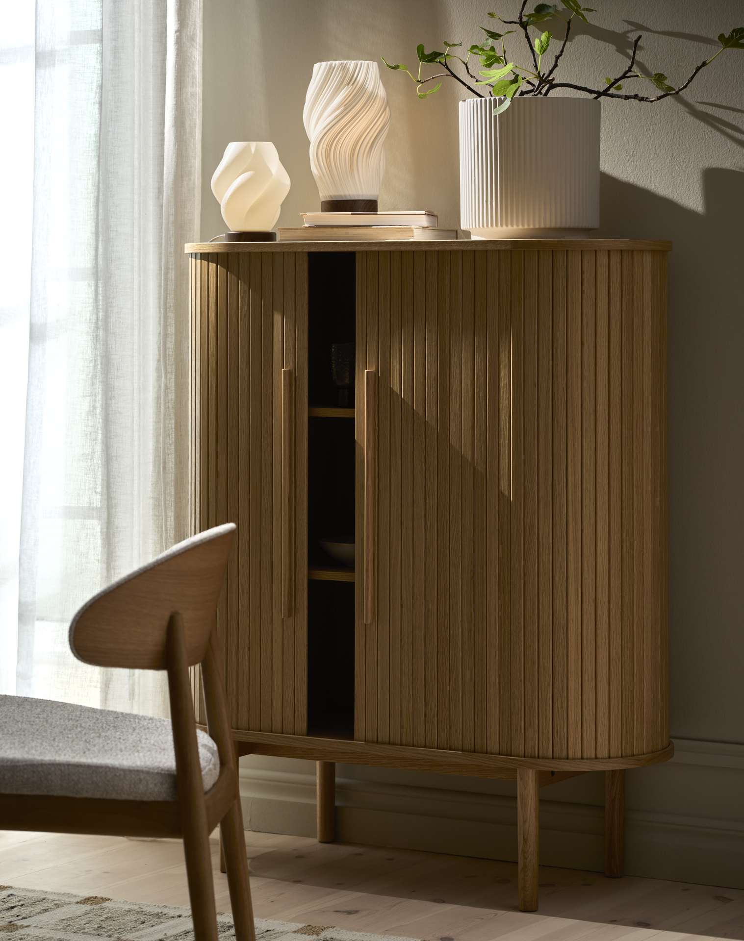 Judit finns även som soffbord, skåp, skänk och tv-bänk för dig som inte kan få nog av det snygga formspråket. Där återfinns de dekorativa ribborna i möblernas jalusidörrar.