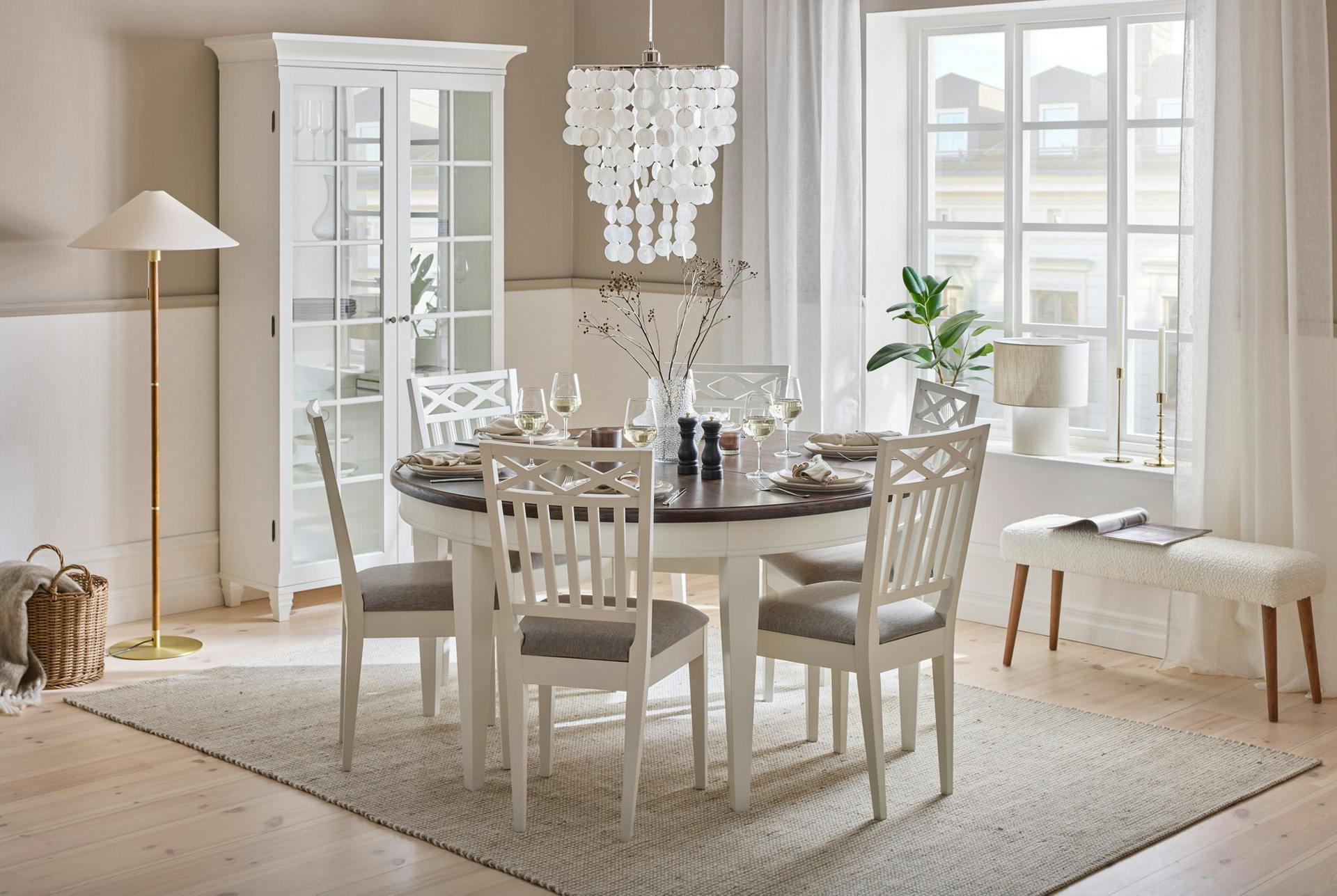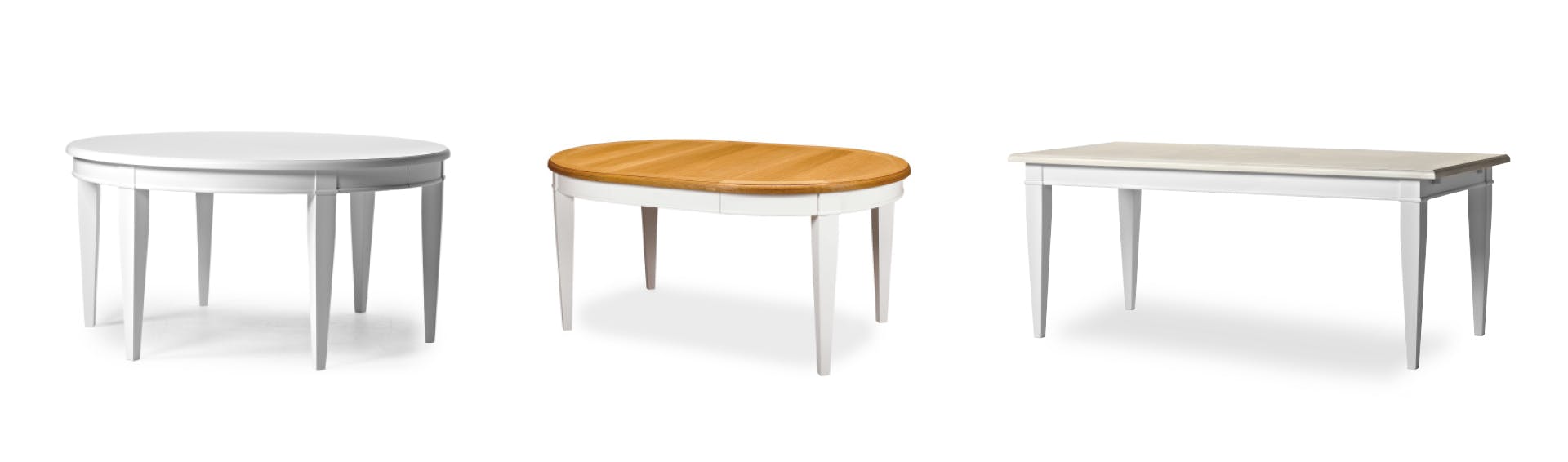 Bordet i vit handmålad björk går att få som runt eller rektangulärt utförande. Bordsskiva finns i flera utföranden. De runda borden är förberedda för iläggsskiva och de rektangulära för tilläggsskiva.