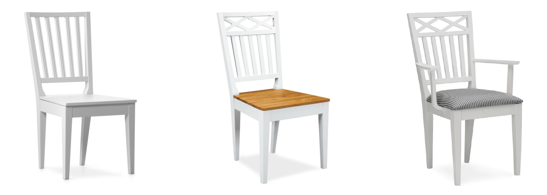 Stolen i vit handmålad björk går att få med träsits eller klädd sits och finns i flera utföranden. Stolen går också att få som karmstol.
