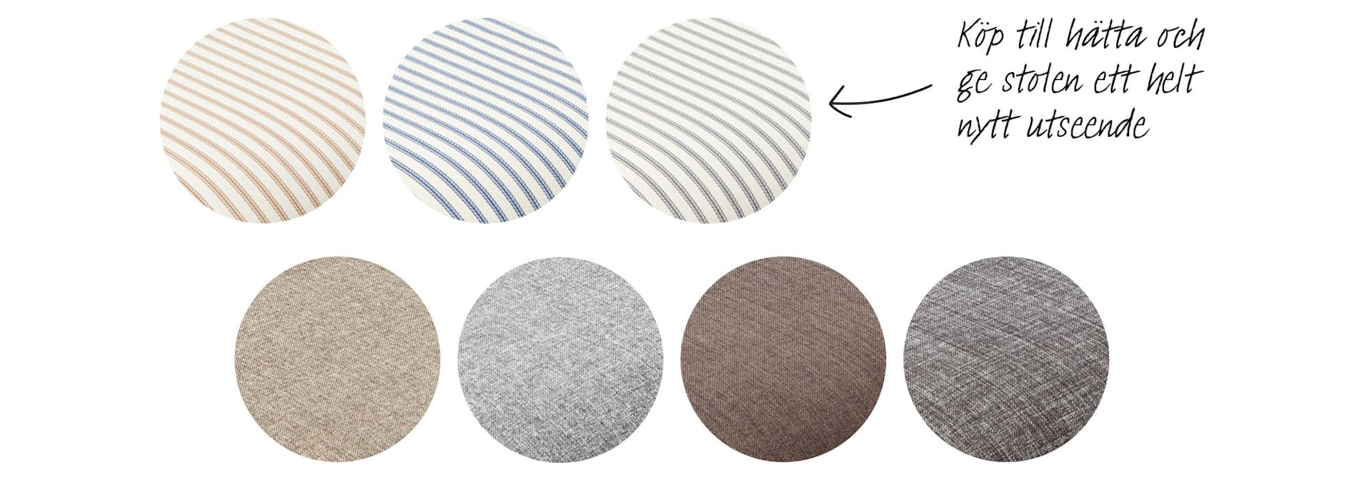 Hättorna är avtagbara och maskintvättbara. Finns i randiga utföranden som beige, blå och grå och i helfärgerna blå, brun, ljusbrun, mörkgrå och ljusgrå.