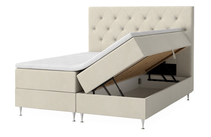 I madrassbottnarna finns en pocketresår som ger stabilitet och extra följsamhet. För extra bra komfort har vi lagt på en sju centimeter tjock bäddmadrass som bidrar till en ytmjuk känsla. Den har en kärna av polyeter, svept med fibervadd med en liggyta av stretchtyg för bästa tänkbara följsamhet. I priset ingår bäddmadrass och metallben.