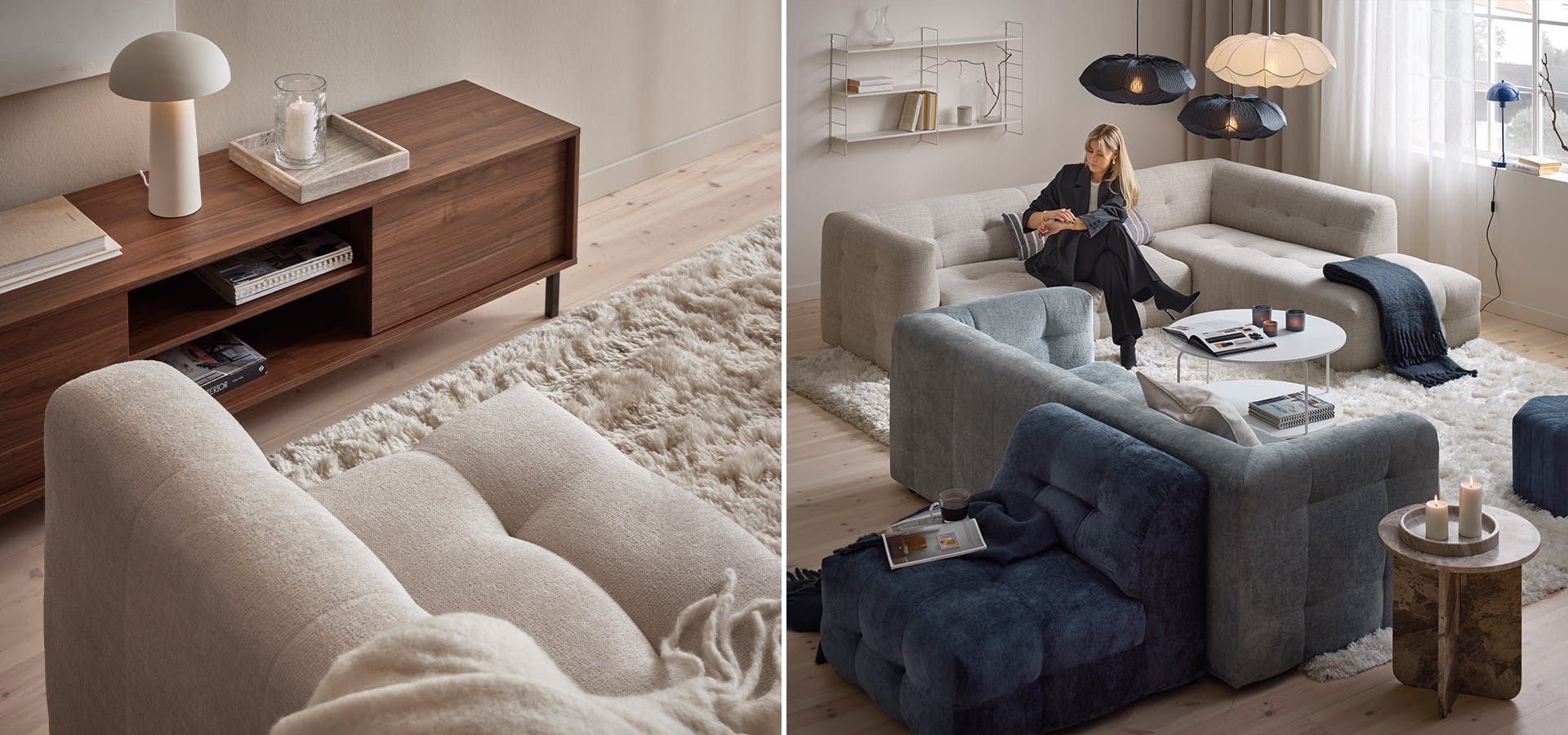 Prisvärda Bella är en trendig soffa med ett formspråk som verkligen tar för sig. De runda bulliga ”bubblorna” gör soffan till ett riktigt blickfång i rummet. Den stabila sitsen och ryggen ger en bra komfort. Dessutom håller soffan formen utan att du behöver puffa några kuddar. En bra bonus!