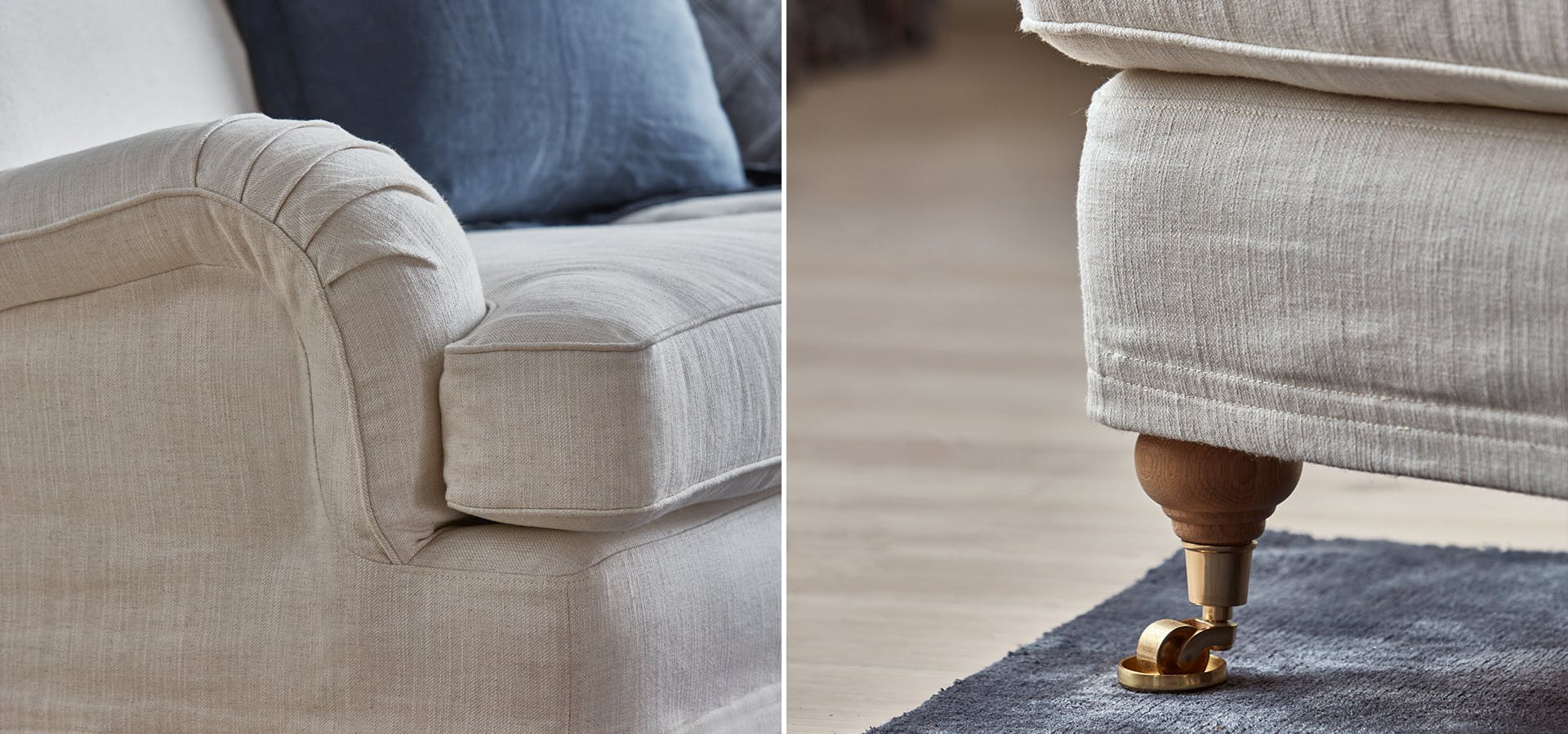 Howardsoffan har de fina vecken på armstödet, liksom de svarvade kurviga benen, som är typiska för modellen. Även de hjulförsedda benen är utmärkande för den klassiska soffan.