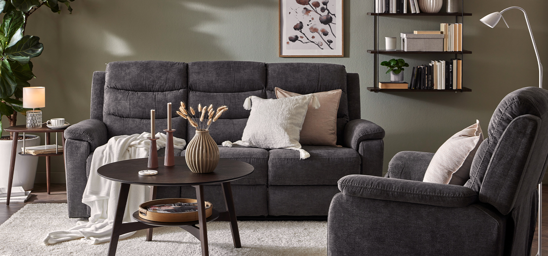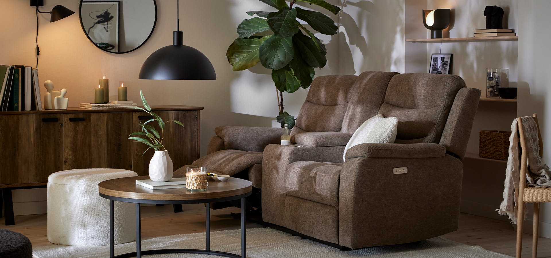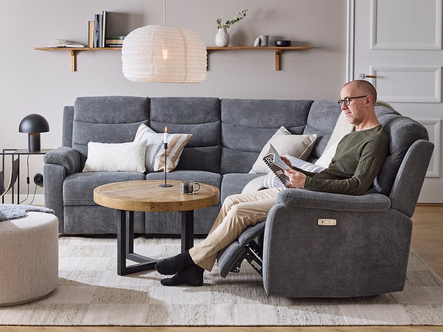 Plats för fler? 3-sitssoffan och även hörnsoffan har elrecliner i ytterplatserna. 3-sitsen finns även med manuell recliner. Och vet du vad? Det finns även en Lazy-fåtölj att mysa ner sig i. Bra att komplettera soffan med eller ha som solitär i ett hörn för exempelvis sköna lässtunder.